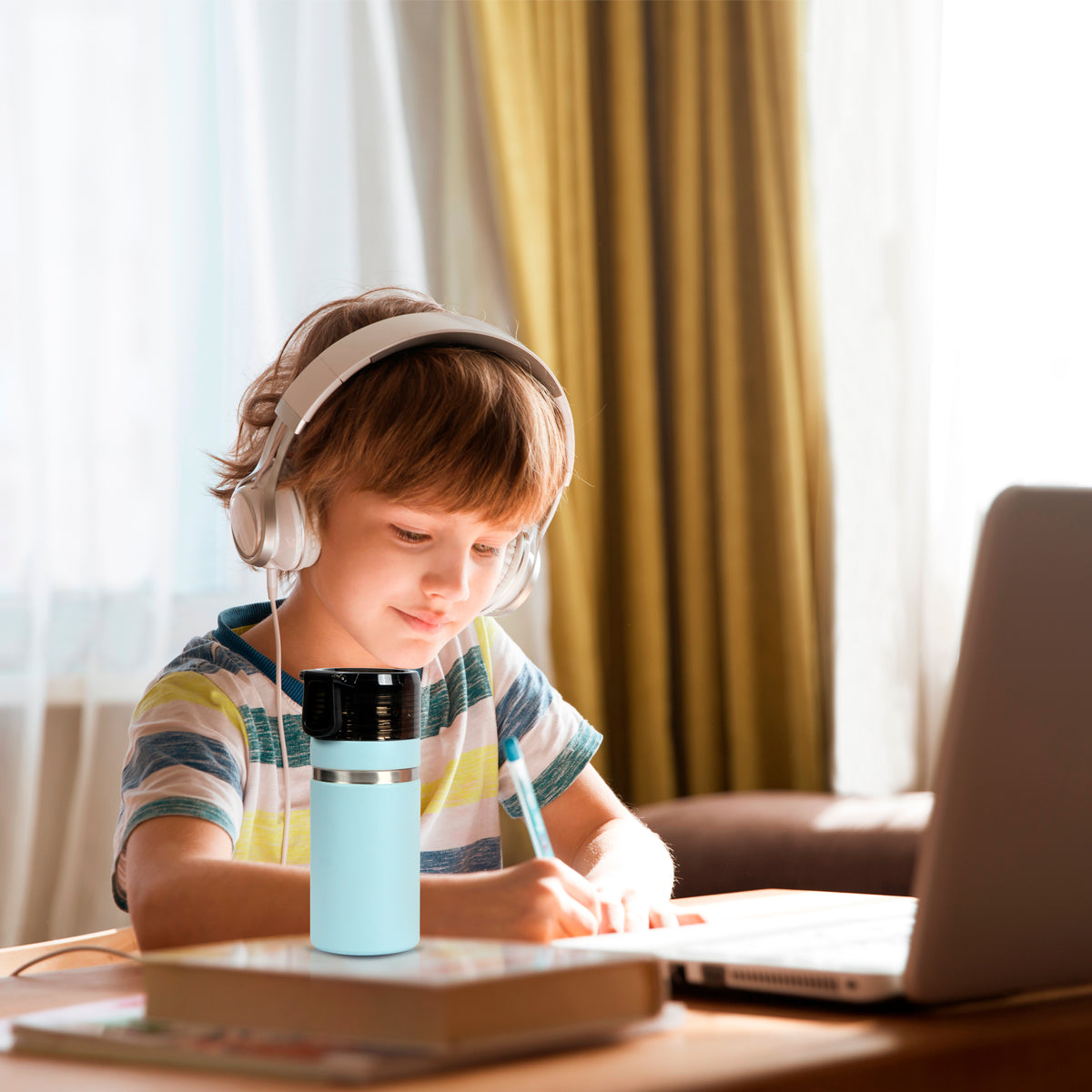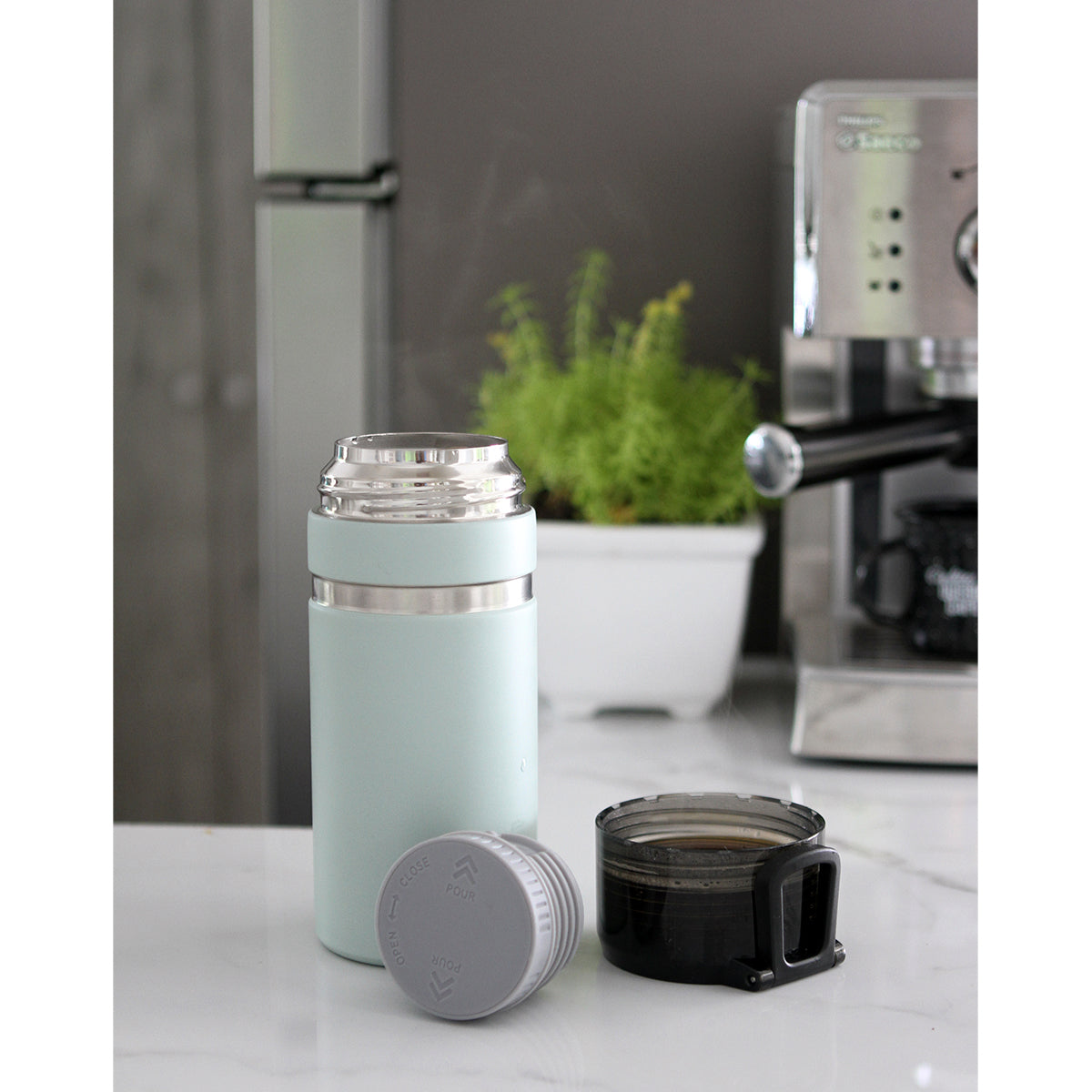 termo de acero inoxidable doble pared con tapa y asa de plástico. fabricado en materiales de grado alimenticio, mantiene bebidas frías o calientes por un largo tiempo. no usar en microondas. capacidad de 500 ml. incluye caja de cartón individual.