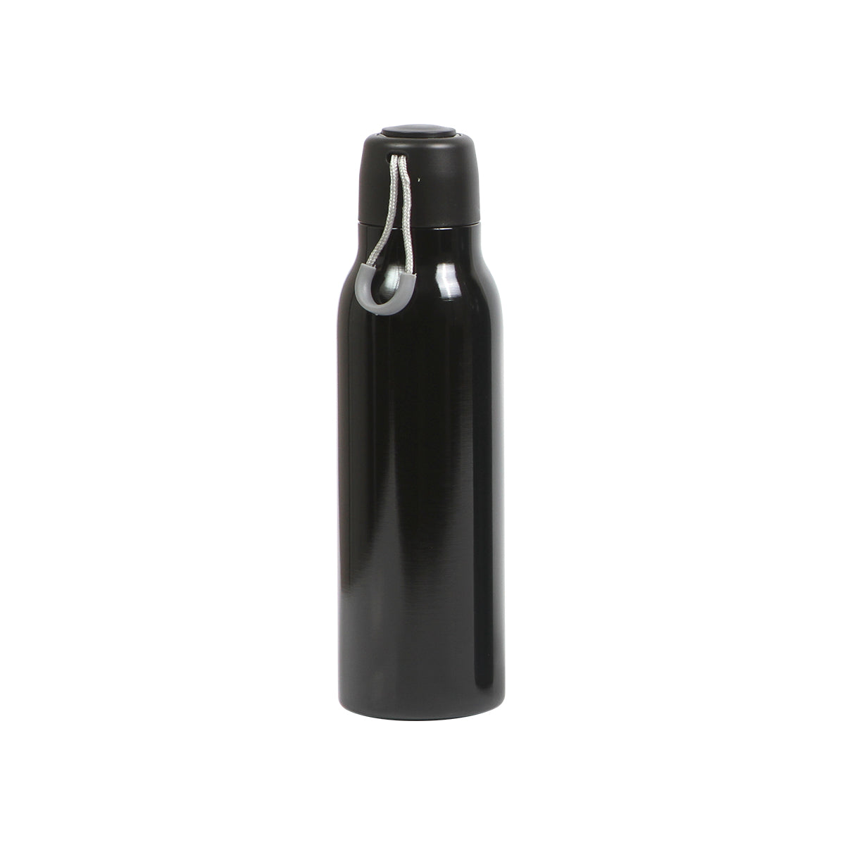 termo de acero inoxidable doble pared acabado brillante, con tapa de plástico y correa textil. fabricado en materiales de grado alimenticio, mantiene bebidas frías o calientes por un largo tiempo. no usar en microondas. capacidad de 500 ml. incluye caja de cartón individual.