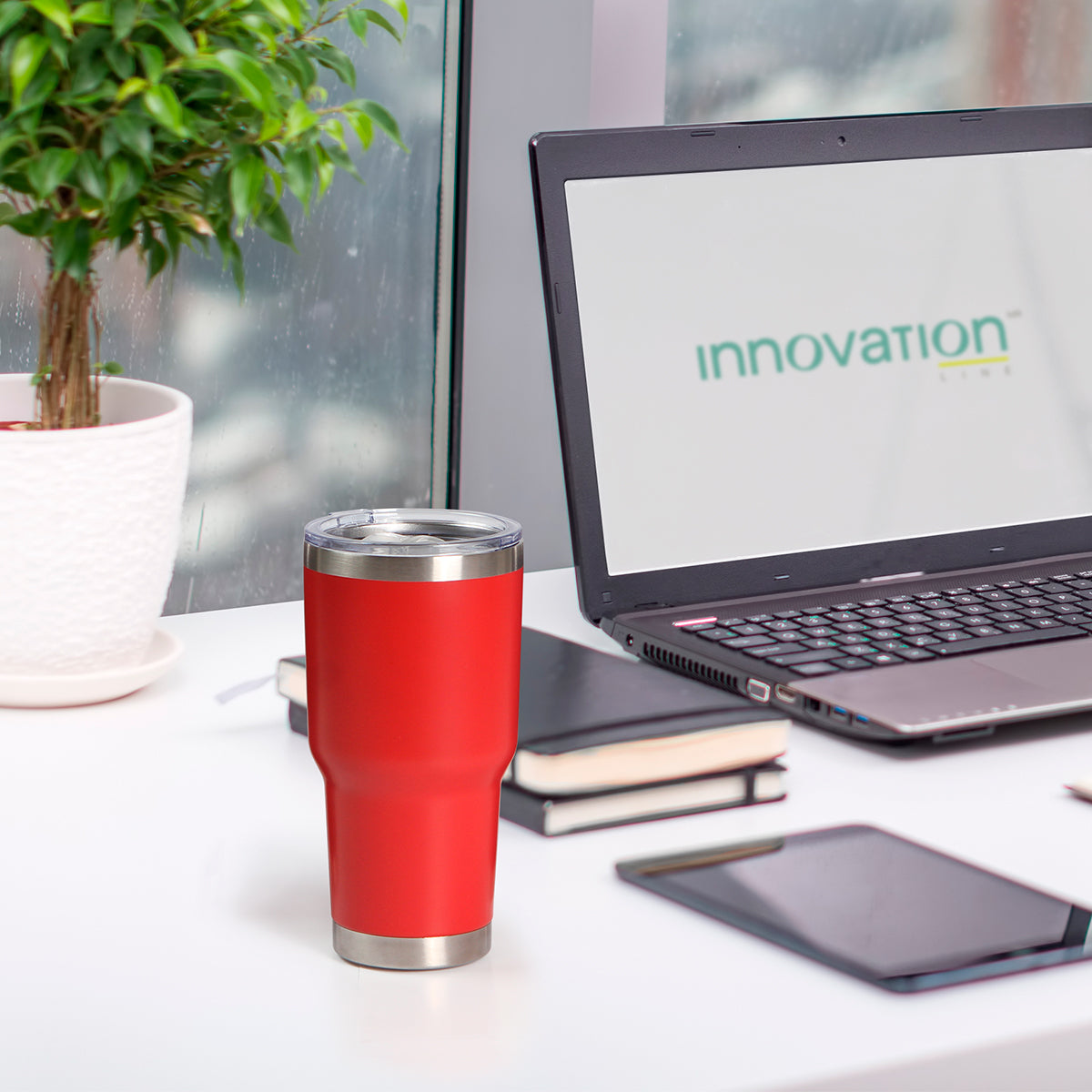 termo de acero inoxidable doble pared acabado mate y detalles plateados en filo y base, con tapa deslizable de plástico transparente. fabricado en materiales de grado alimenticio, mantiene bebidas frías o calientes por un largo tiempo. no usar en microondas. capacidad de 567 ml. incluye caja de cartón individual.