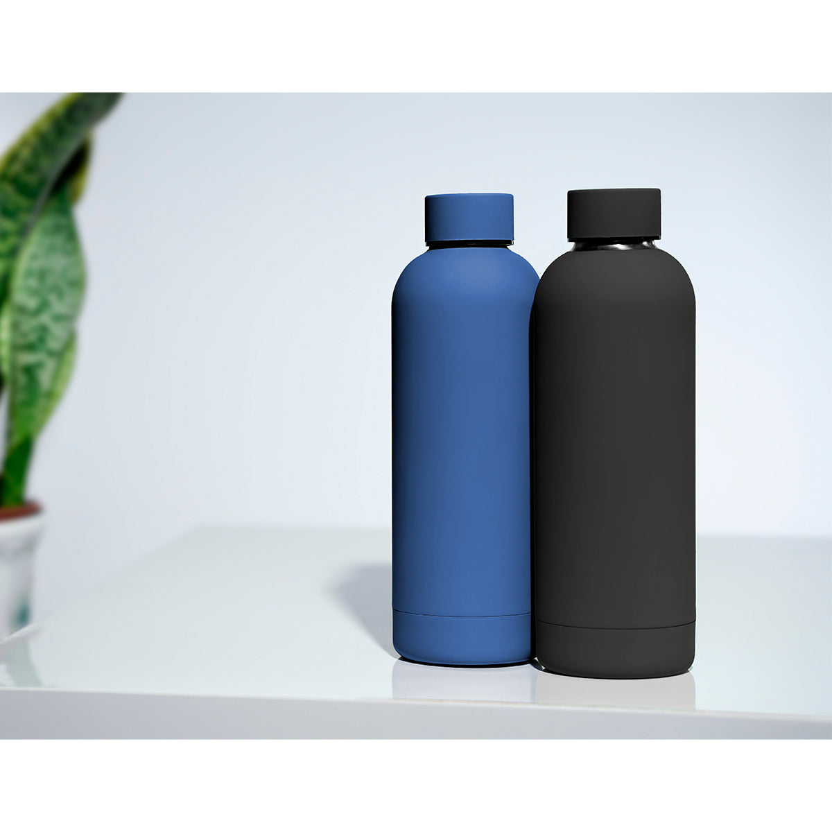 botella de acero inoxidable doble pared con tapa de rosca y acabado tipo rubber. su acabado proporciona un agarre cómodo y seguro. capacidad de 500 ml, no usar en microondas, incluye caja individual.