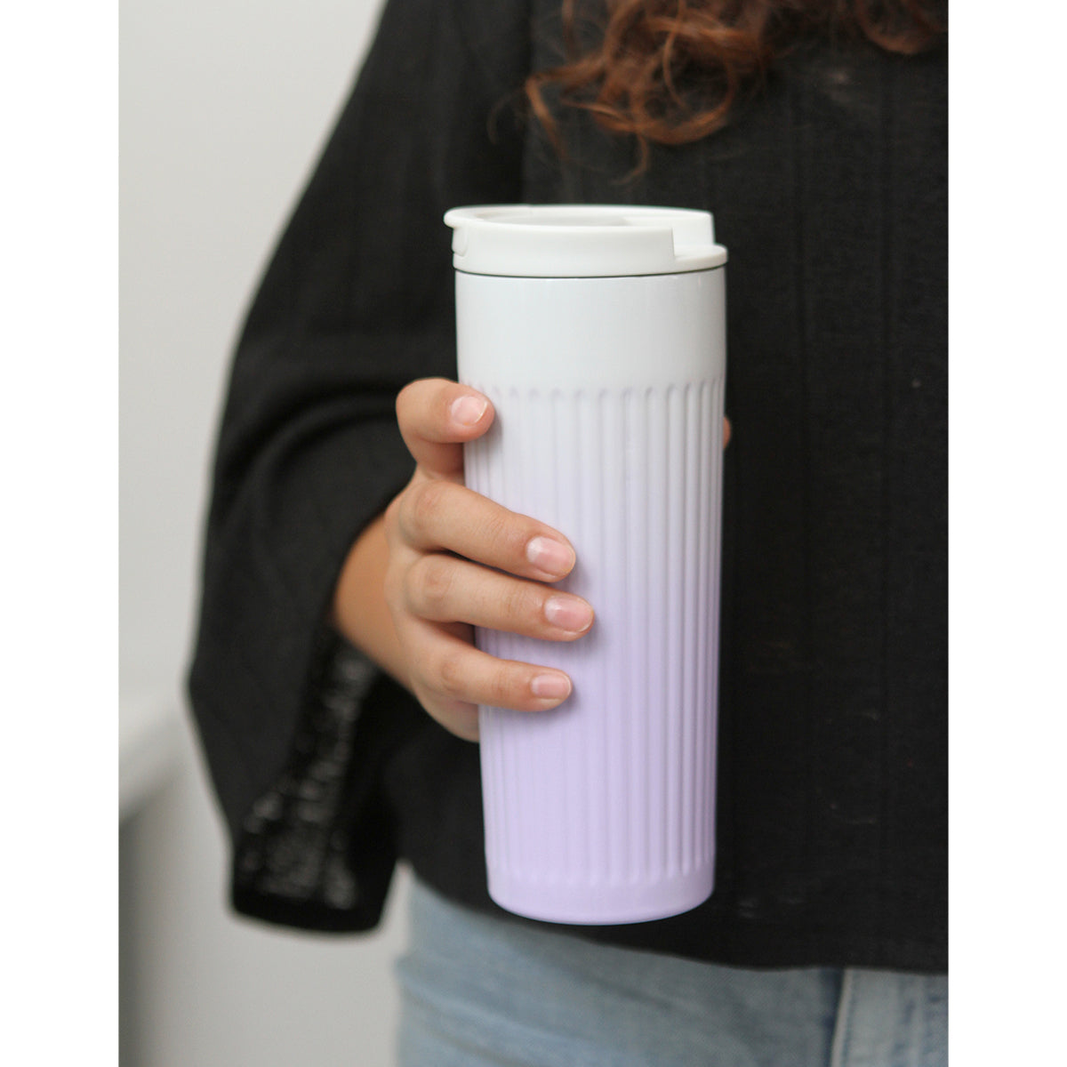 termo cilindro de doble pared de acero inoxidable con tapa plástica y colores degradados, su tapa es ideal para transportar bebidas calientes con seguridad y sin derrames. capacidad de 500 ml, no usar en microondas, incluye caja individual