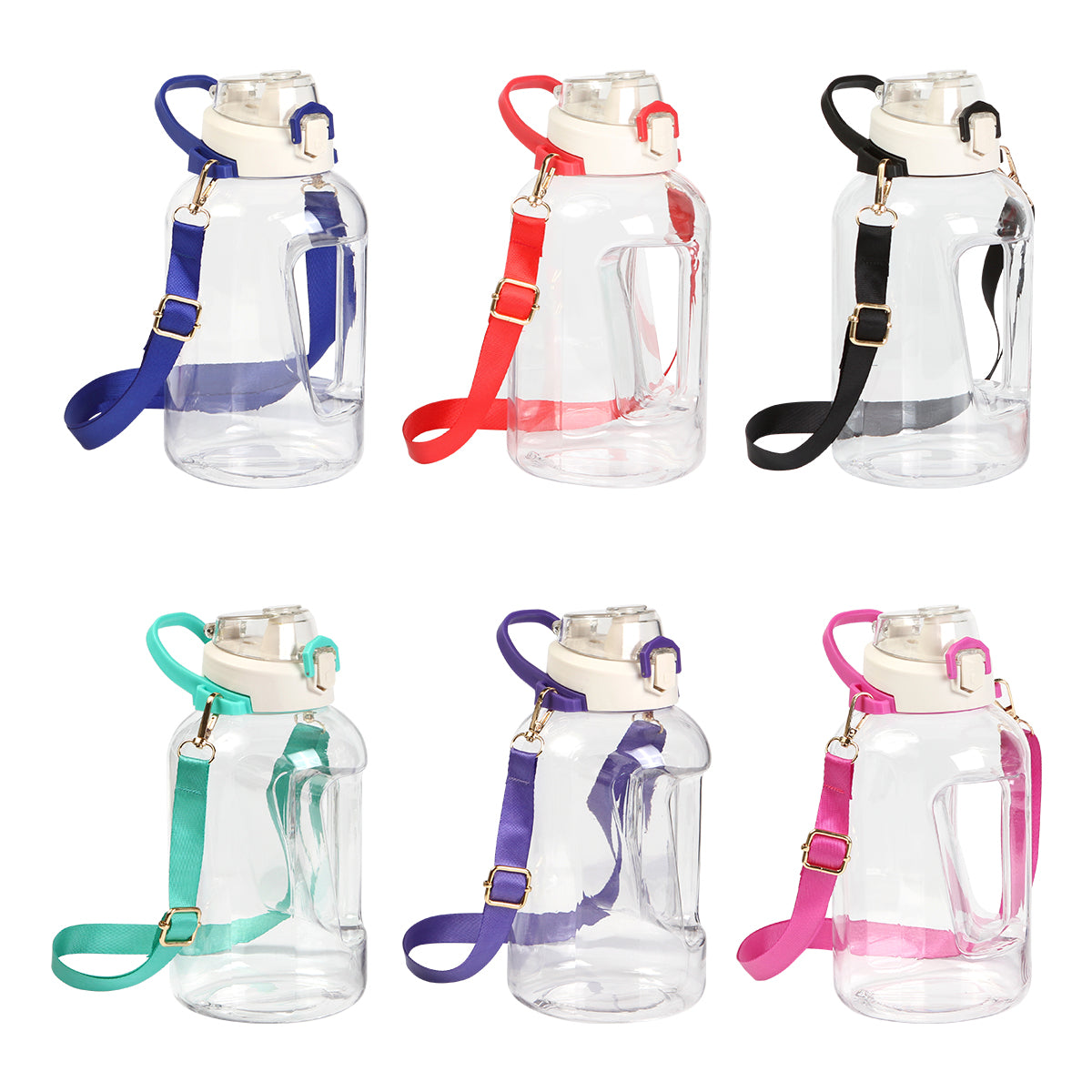 botella jumbo de plástico transparente con capacidad de 1.4 litros (48 oz), tapa con botón de seguridad, correa de color con arnés y agarradera, su tapa en rosca es ideal para mantener seguro el liquido de la botella, y su correa de color con arnés desmontable se puede ajustar a tu gusto .