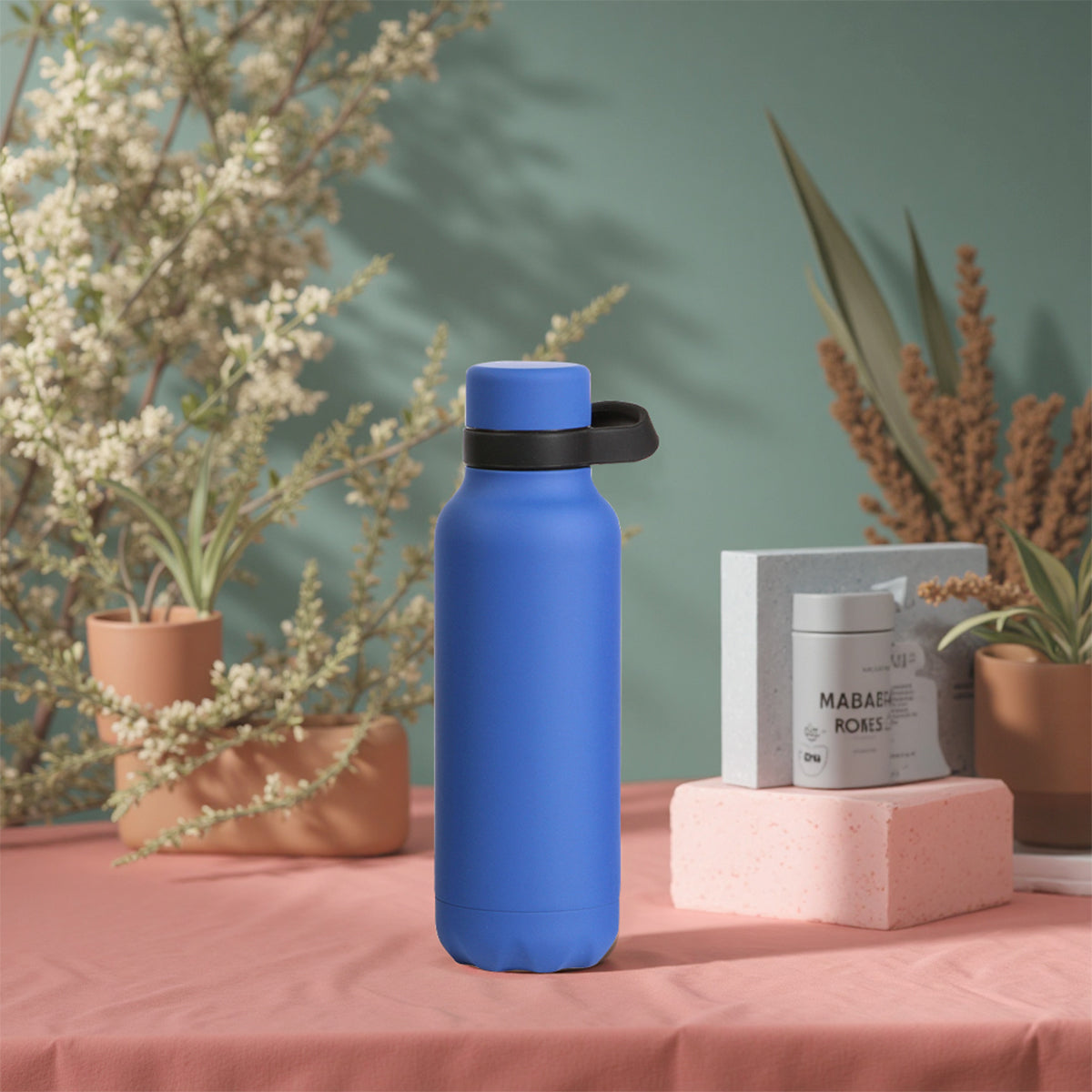termo de acero inoxidable con tapa de rosca y asa para fácil transporte. capacidad de 750 ml, su diseño permite llevar el termo a cualquier parte evitando derrames y su textura de terciopelo teniendo un mejor agarre, el acero inoxidable permite mantener tu agua fría por más tiempo.
