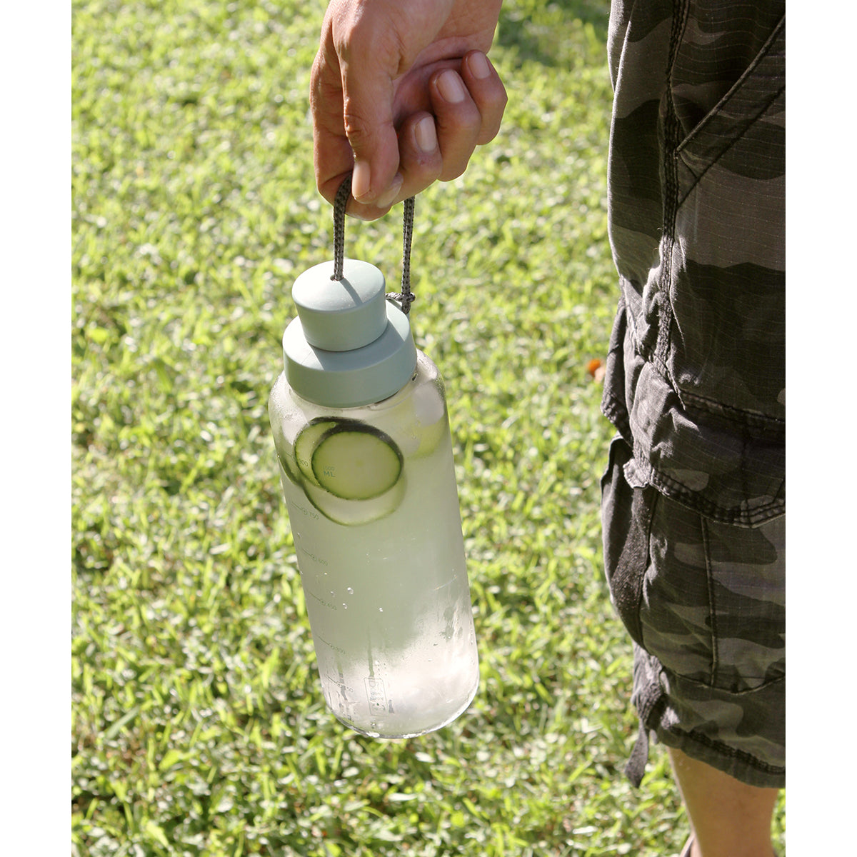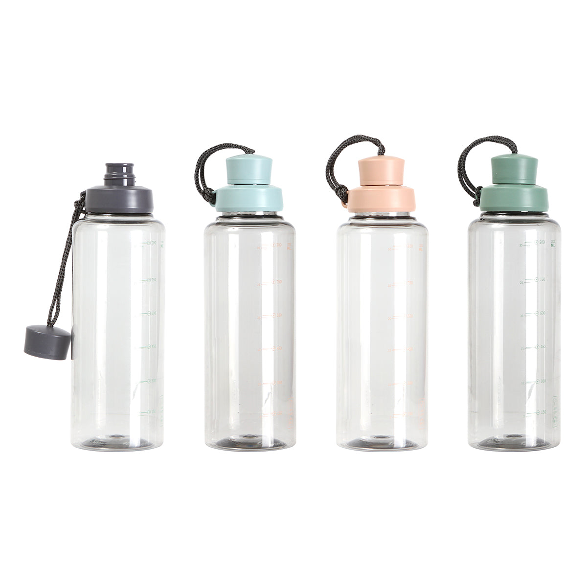 cilindro transparente fabricada en policarbonato, con indicadores en mililitros y onzas, tapa de color y cordón sujetador tipo asa. capacidad 1 litro.