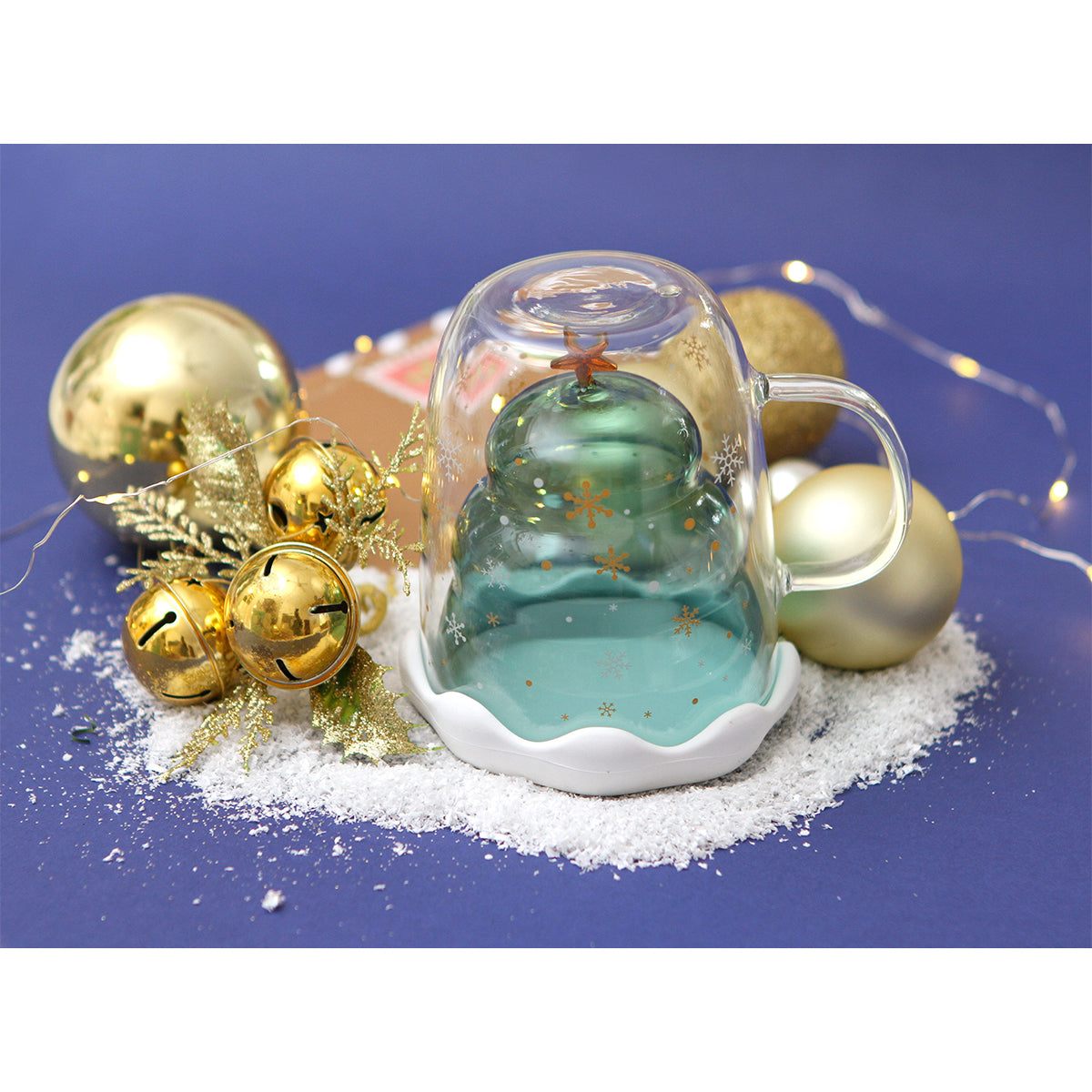 taza fabricada en vidrio, doble pared con diseño de árbol de navidad, incluye base de silicón en forma de nieve, capacidad de 300 ml. sorprende a tus seres queridos con este regalo inolvidable y único.