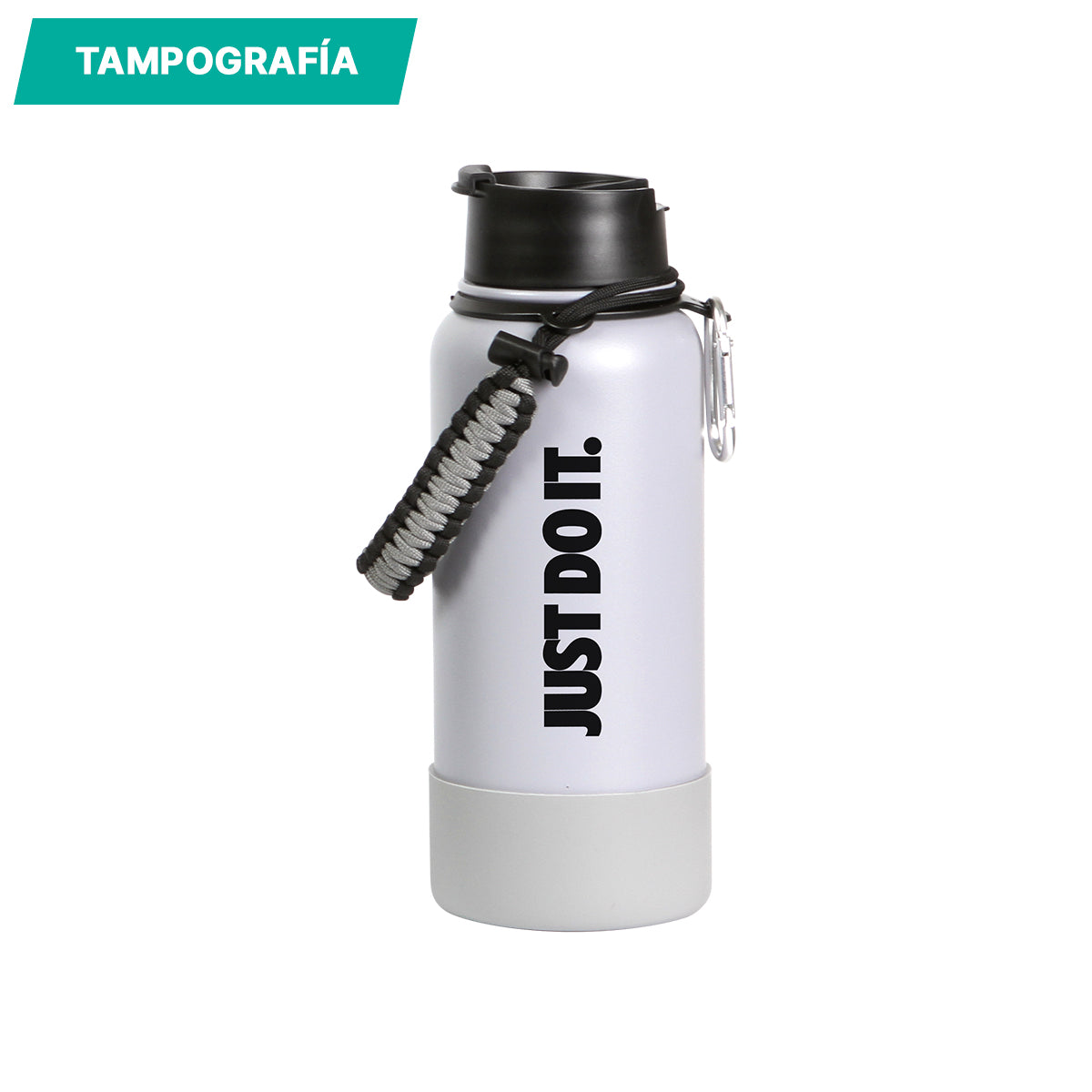 botella deportiva, fabricada en acero inoxidable doble pared. tapa de rosca con boquilla. cuenta con capacidad de 1,000 ml. incluye arnés, correa con detalles en gris y base de silicón anti derrapante.
