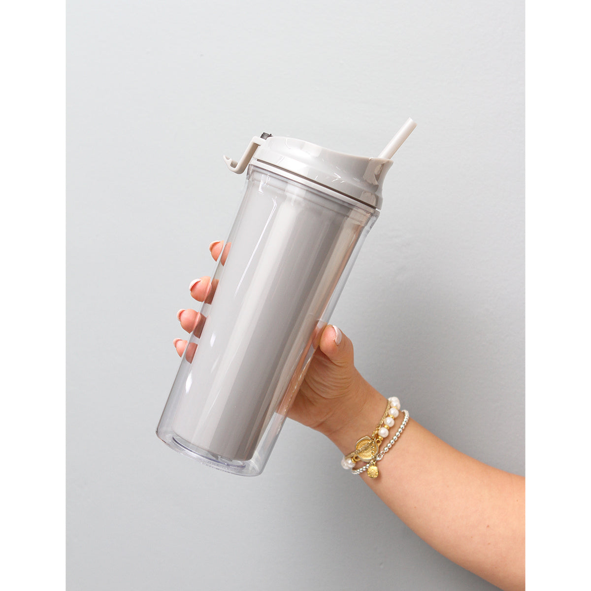 botella doble pared; pared interna de color y externa transparente, fabricado en acrilonitrilo estireno (as). incluye popote fabricado en poliestireno (ps). el diseño de la tapa también ayuda a beber directo de la boquilla . capacidad de 690 ml.