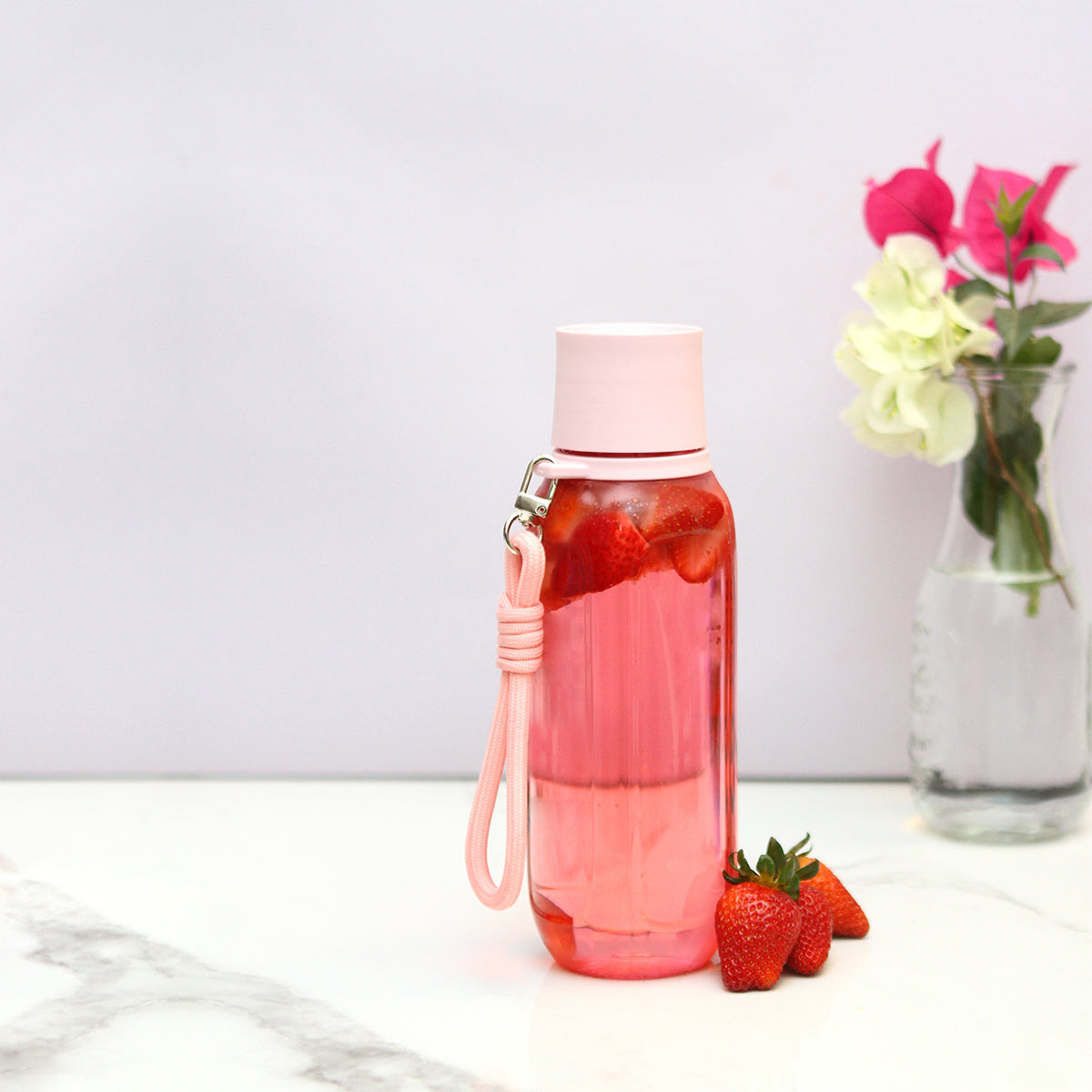 botella deportiva de una pared fabricada en tritán, con cuerpo transparente y tapa de color. capacidad de 600 ml, con correa resistente sujetada con arnés y escala en milímetros.