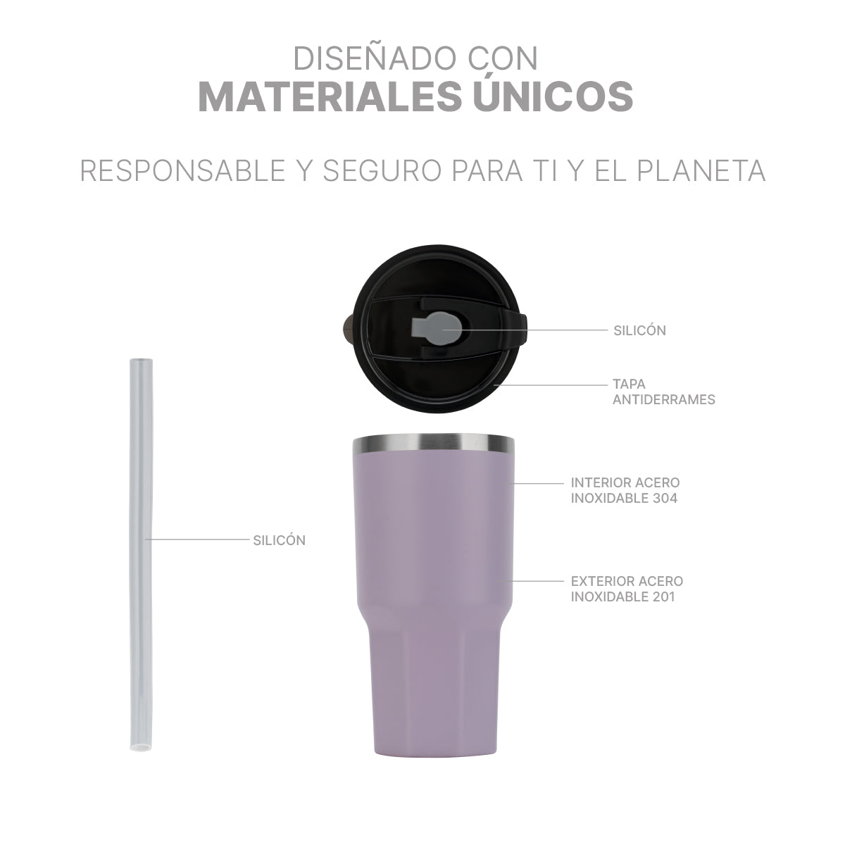 vaso doble pared fabricado en acero inoxidable 304 y 201. capacidad de 940 ml. su tapa de seguridad cuenta con entrada hermética para popote de silicón, la cual se puede cerrar y beber directamente del termo.