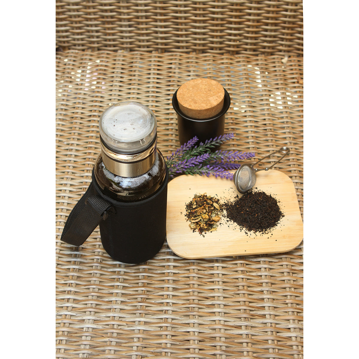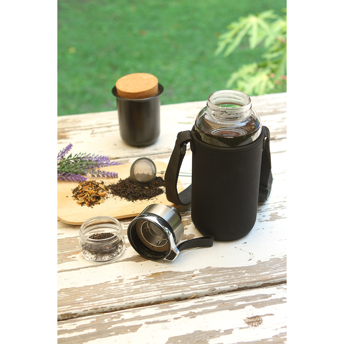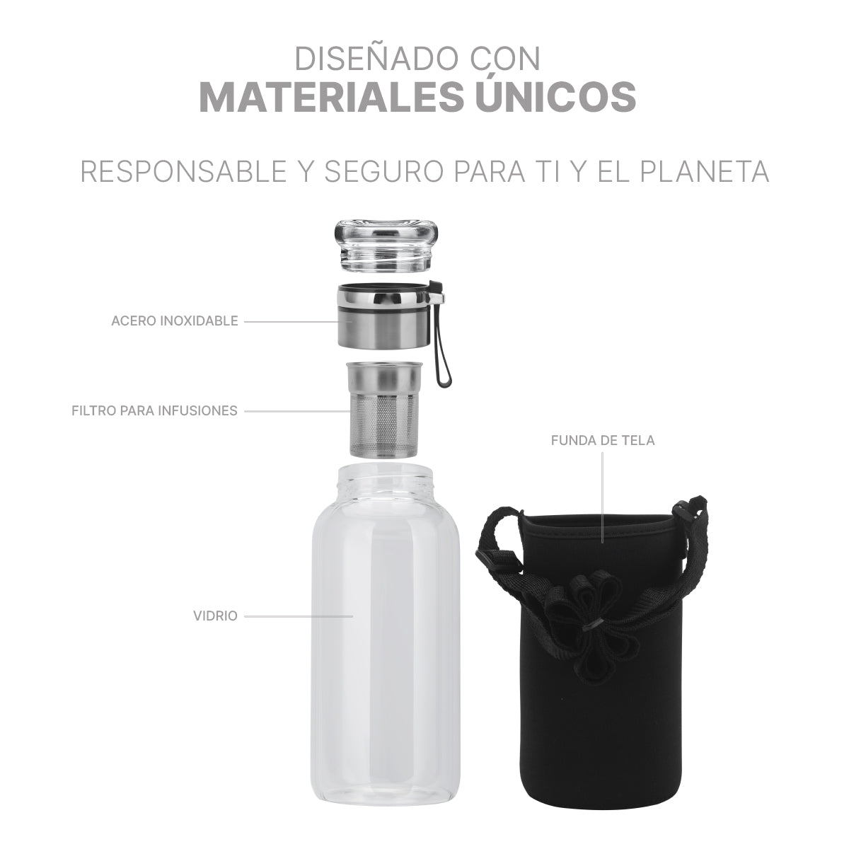 botella especial para té, fabricada en vidrio. capacidad de 1,400 ml. la tapa incluye rejilla para agregar infusiones y funda de tela con correa ajustable. el té puede colocarse en la tapa o en el cuerpo de la botella. ideal para disfruta de un té delicioso y lleno de sabor en cualquier lugar.