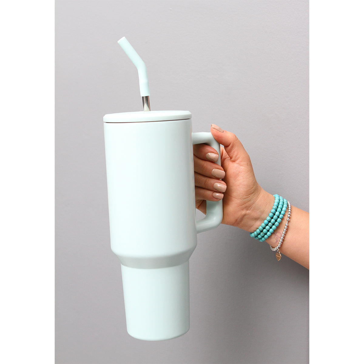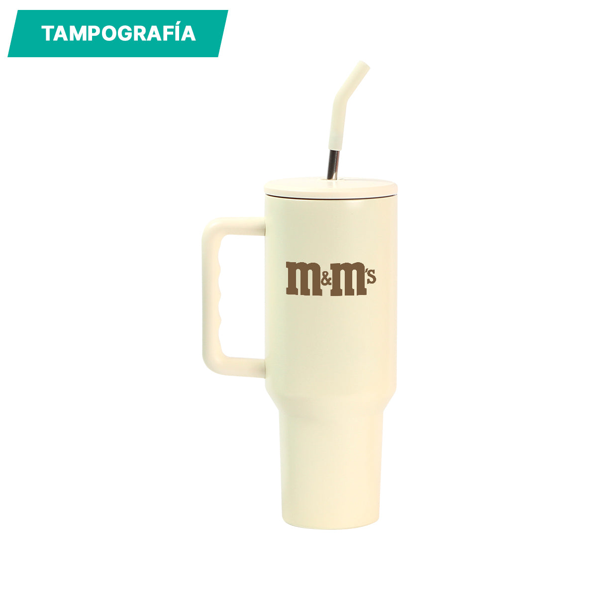 termo fabricado en acero inoxidable de doble pared, tapa con entrada hermética para popote. capacidad de 1,200 ml. incluye agarradera y popote con boquilla de silicón.