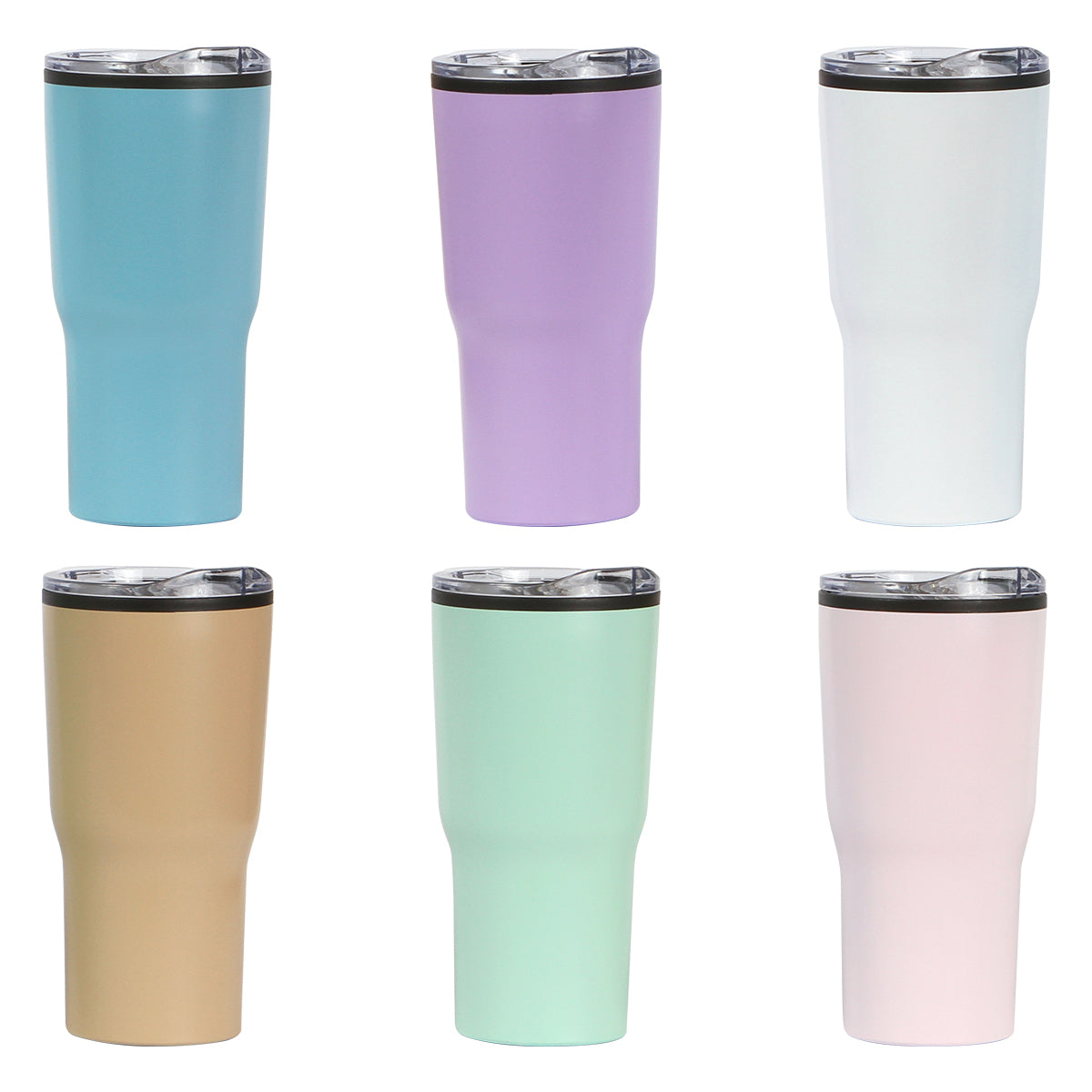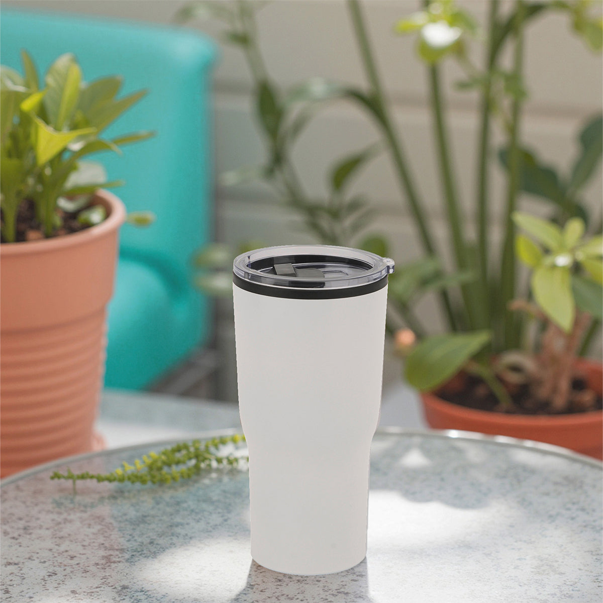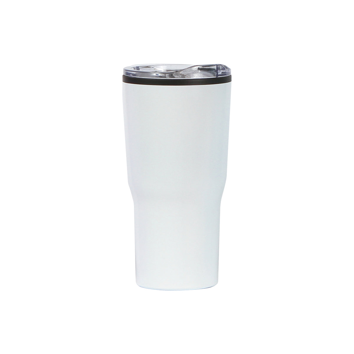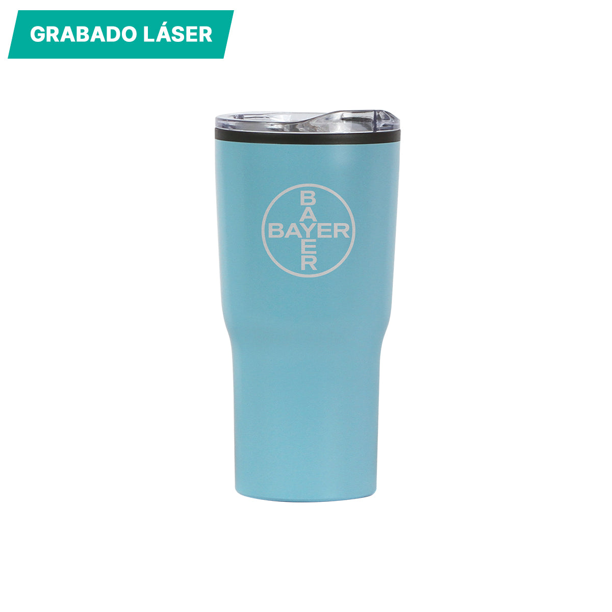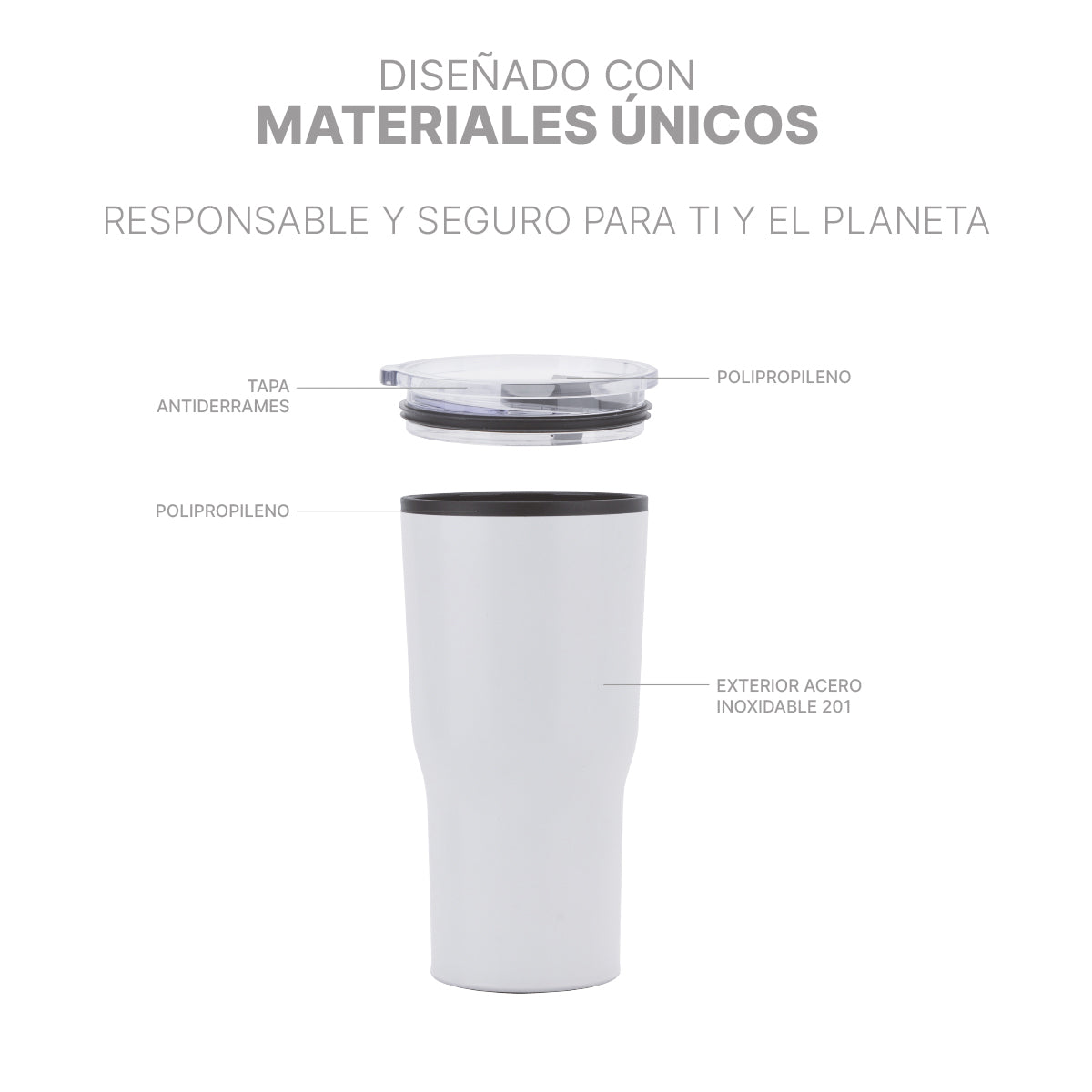 termo de doble pared con el interior fabricado en plástico y el exterior de acero inoxidable. capacidad de 590 ml. (20 onzas). incluye tapa transparente deslizable, con anillo de silicón para sellado.