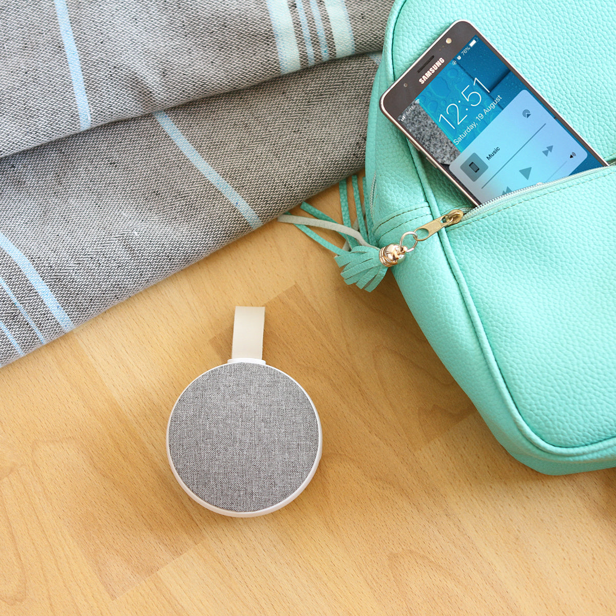 bocina con conexión de sonido sin cables, con radio fm, resistente al agua con acabado tipo rubber, detalles en tela de poliéster y asa superior. carga a través de cable usb (incluido). incluye caja de cartón individual.