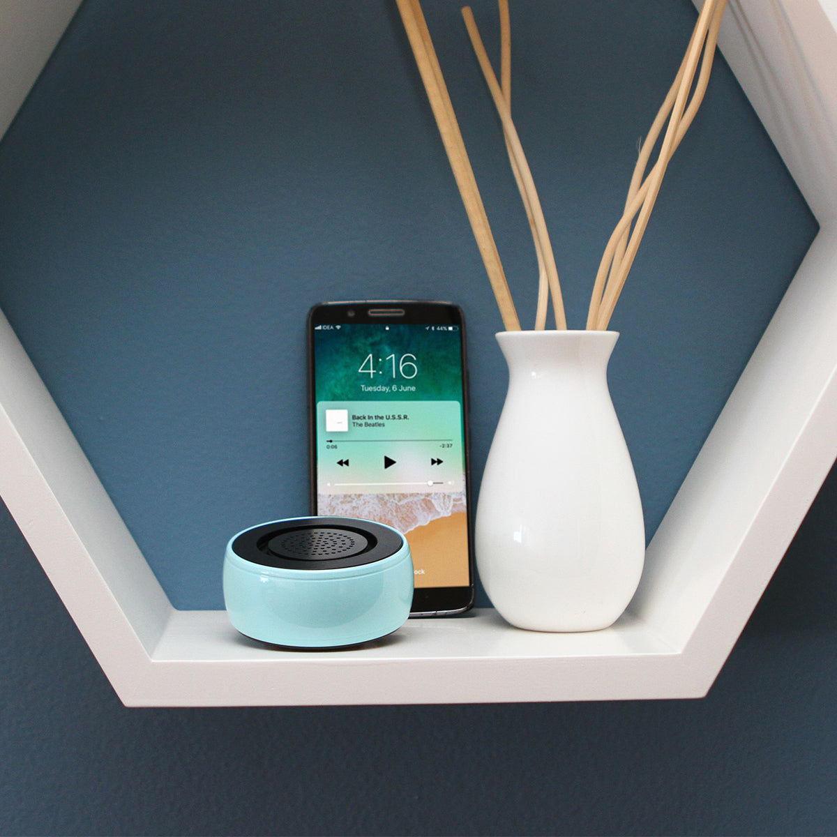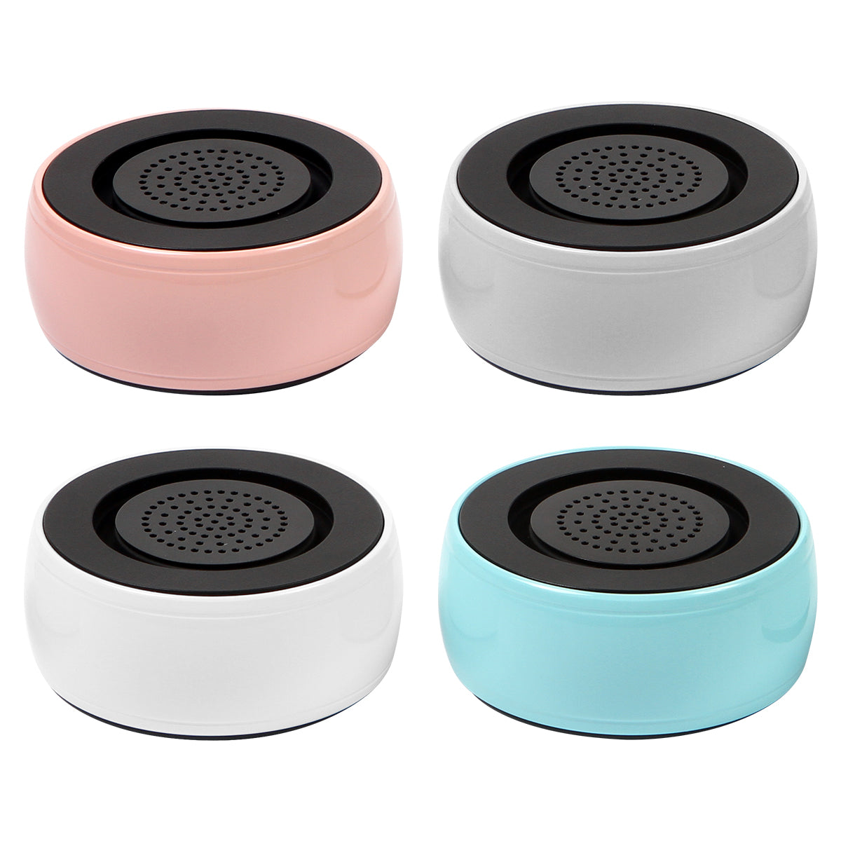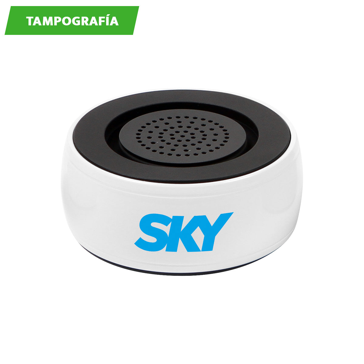 bocina con conexión de sonido sin cables, portátil circular fabricada en metal y plástico, de tamaño compacto lo que la hace fácil de transportar, con radio fm, entrada auxiliar para audio y tarjeta tf.