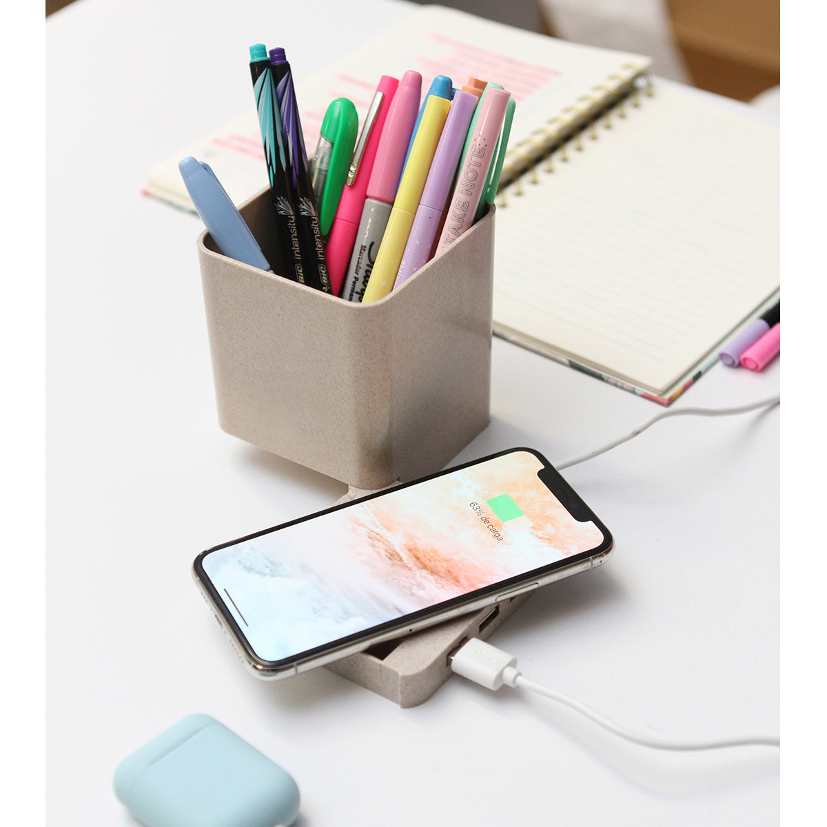 porta lápices fabricado en fibra de trigo y plástico abs, con cargador inalámbrico para dispositivos móviles de 5w y 3 salidas usb, de tamaño compacto lo que lo hace fácil de transportar. carga a través de cable usb (incluido). incluye caja de cartón individual.
