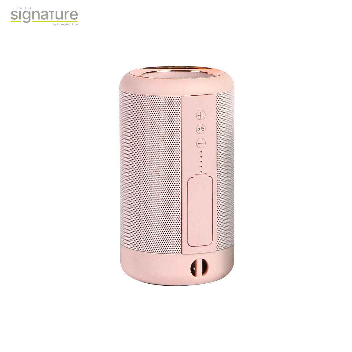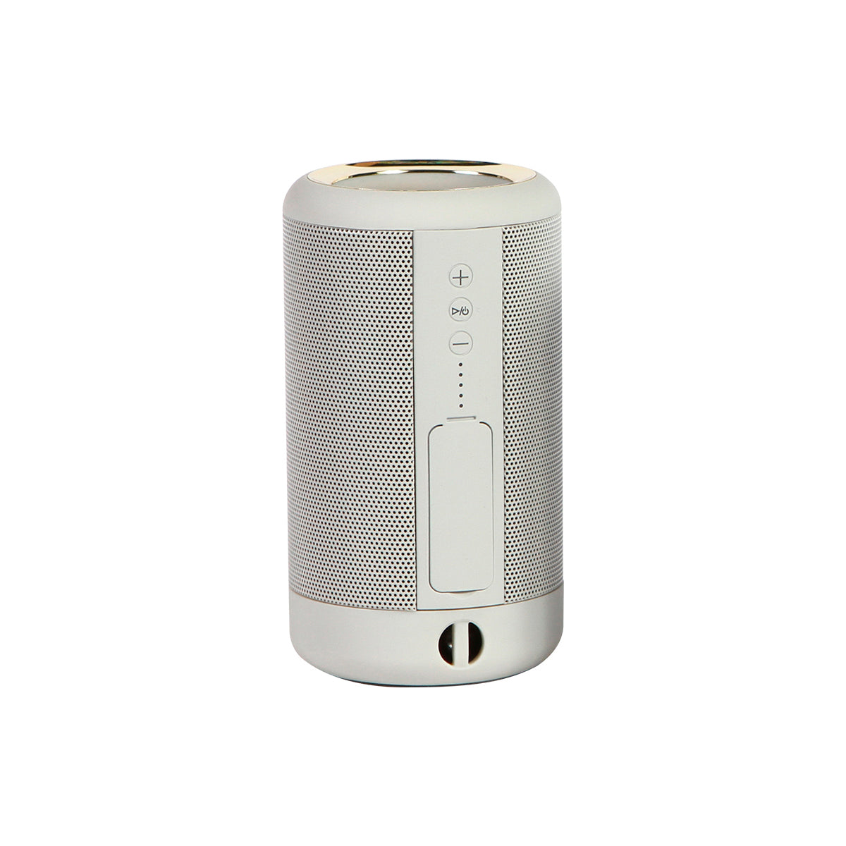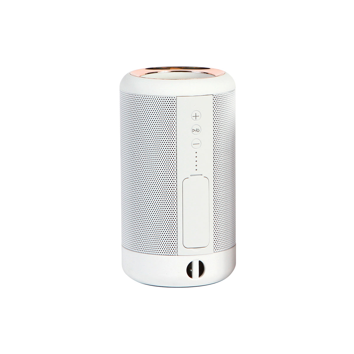 bocina con conexión de sonido sin cables, power bank con capacidad de 1,200 mah, batería integrada de iones de litio, fabricada en plástico abs con acabado rubber (suave), con un detalle color dorado en la parte superior, con entrada protegida.