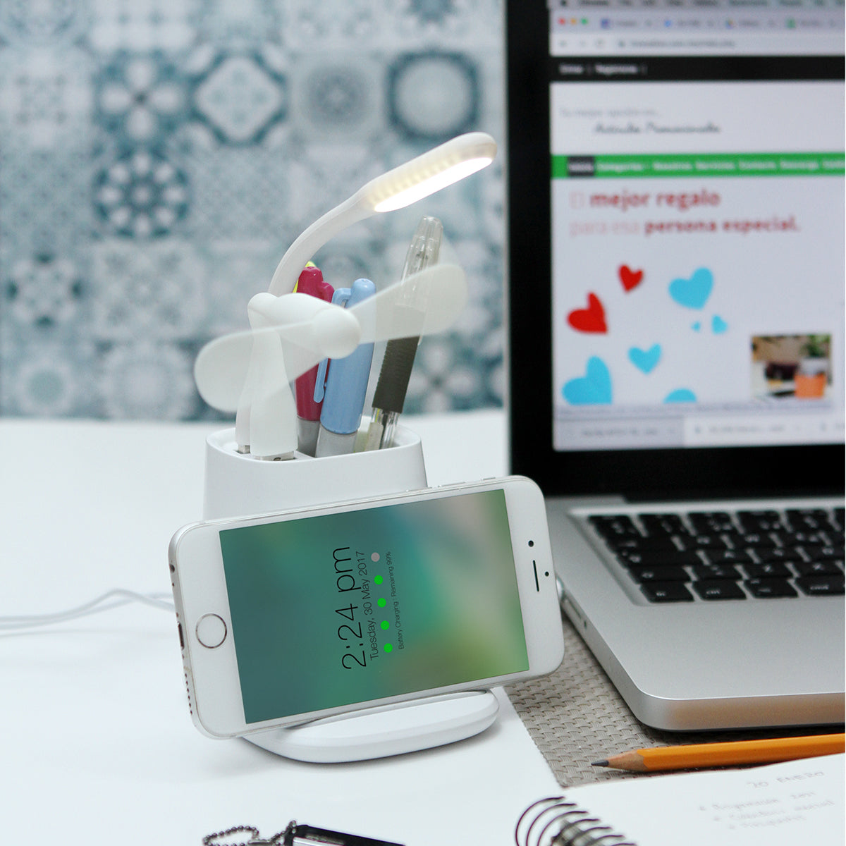 porta lápices multifuncional fabricado en plástico abs, con cargador inalámbrico tecnología wpc qi v1.2.4, soporte de silicon para teléfono celular, dos puertos usb, ventilador, lámpara led y entrada de carga tipo c. incluye caja de cartón individual.