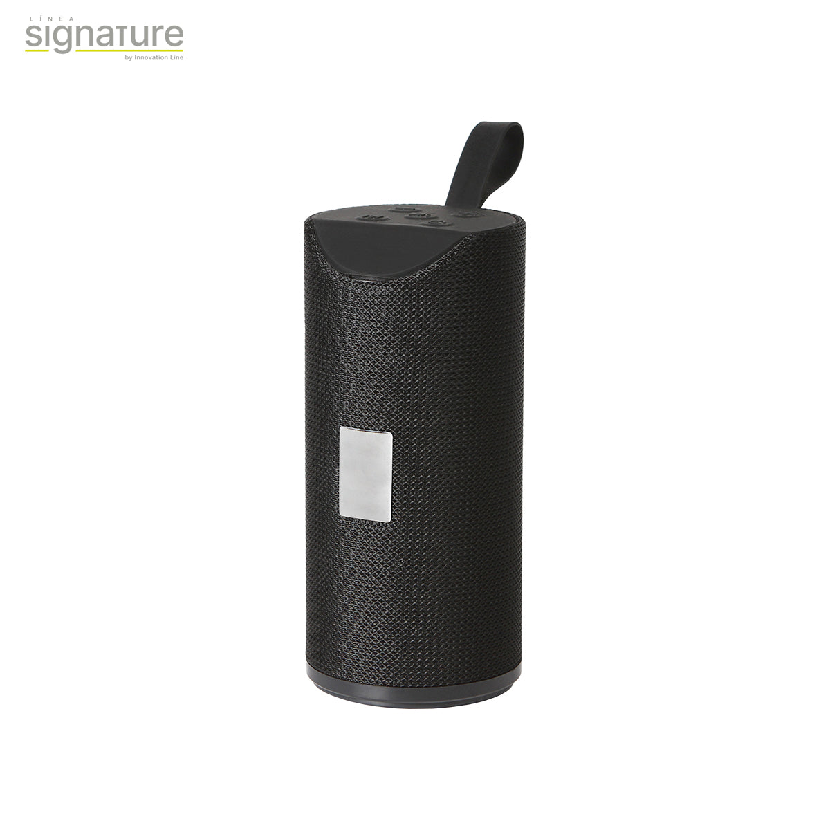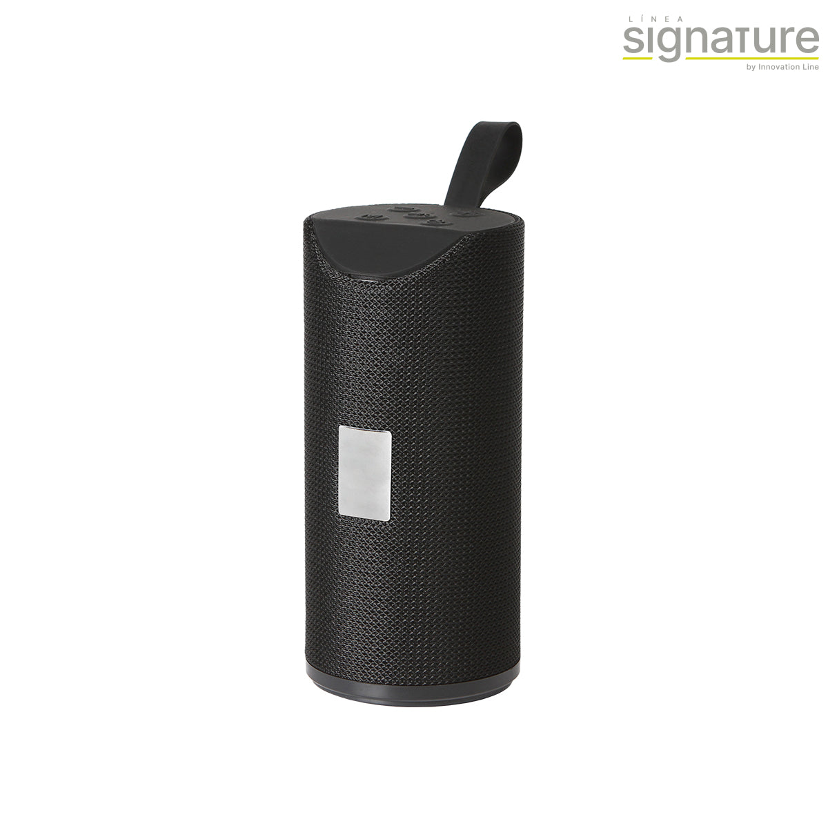 bocina con conexión de sonido sin cables, asa en la parte superior, con una placa en la parte frontal para grabar, botones en la parte superior, carga a través de cable usb (incluido), cable auxiliar para audio y caja individual de cartón.