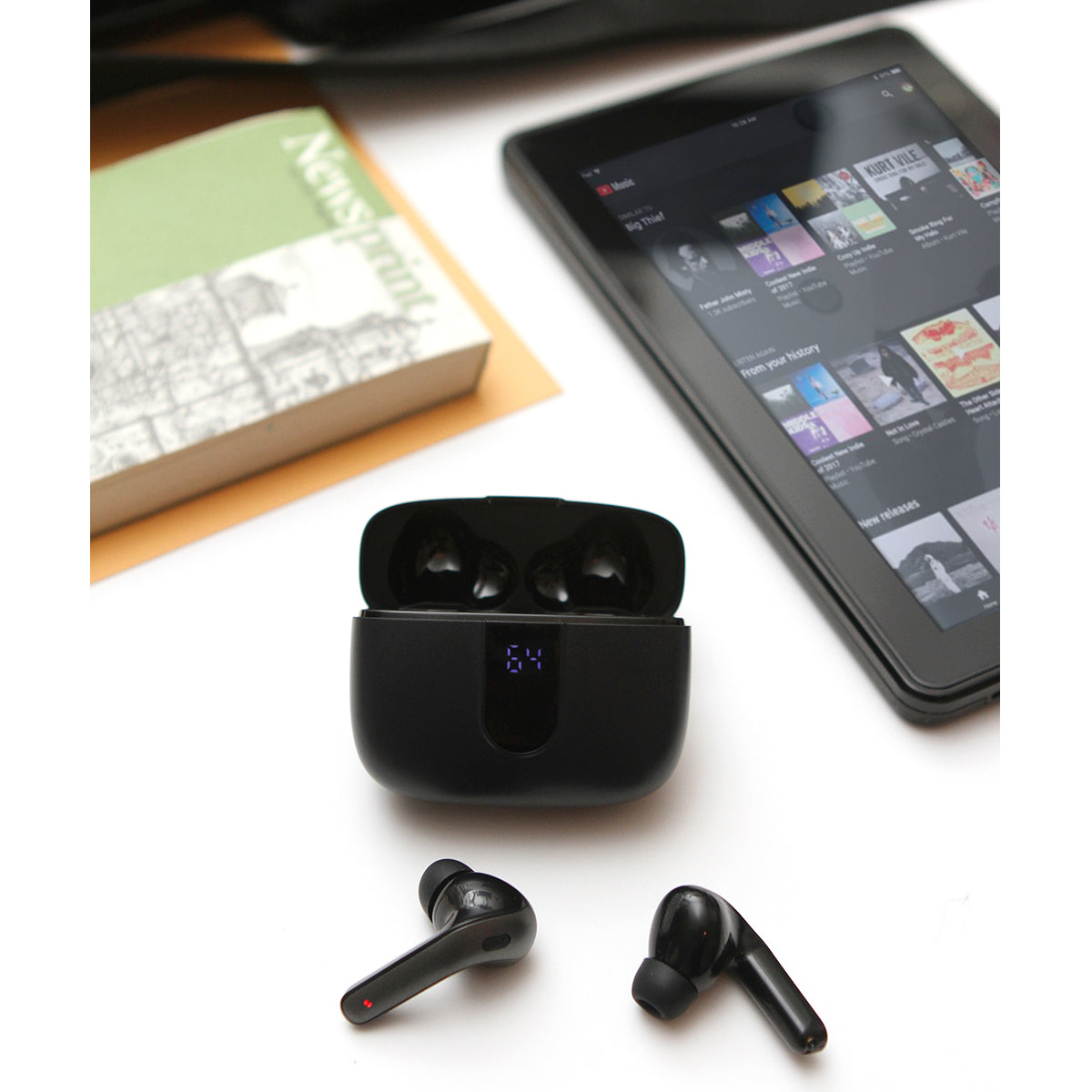 audífonos con conexión de sonido sin cables a prueba de agua y función touch, fabricados en plástico abs, con display en la parte frontal que muestra el nivel de batería. incluye cable de carga usb y caja de cartón individual.