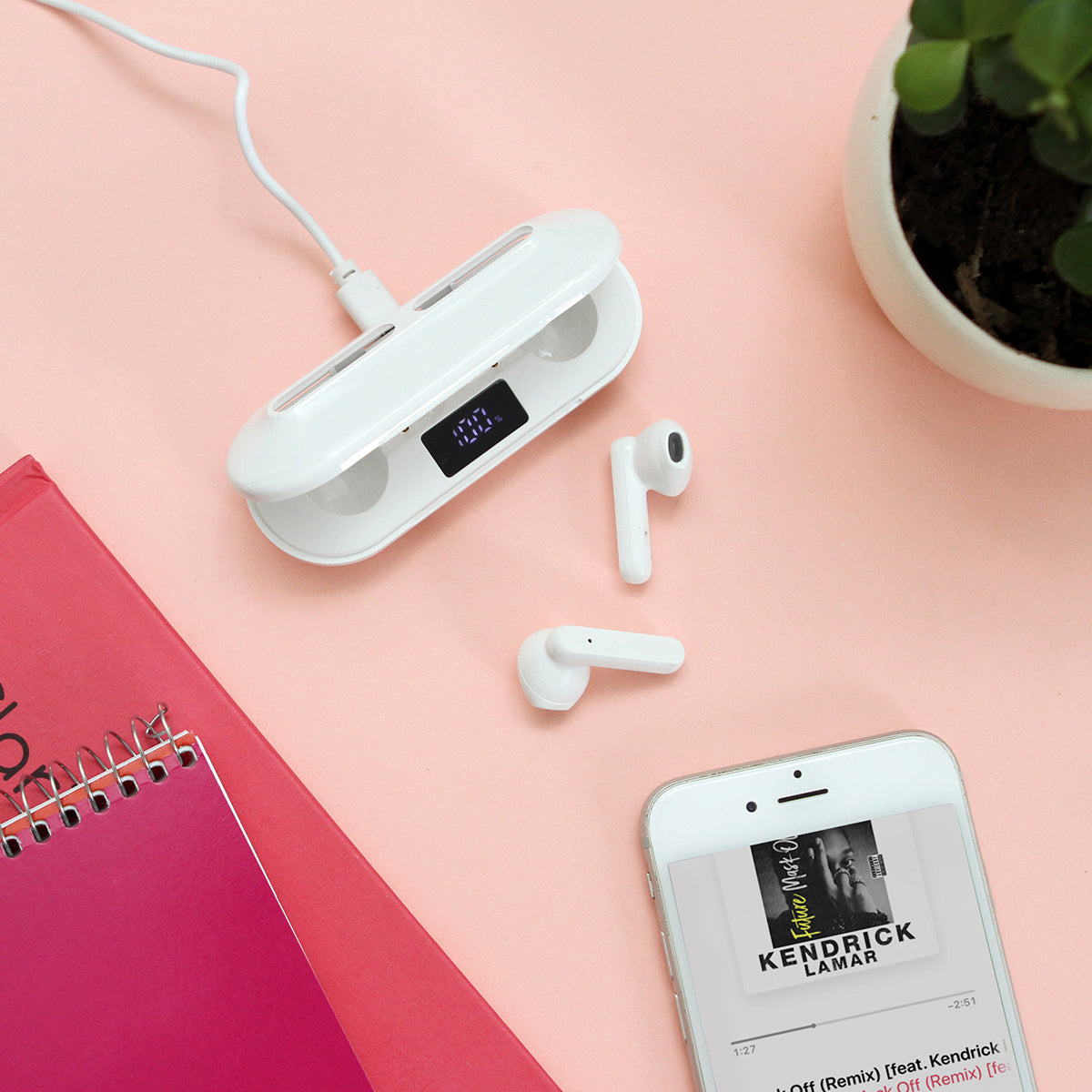 audífonos con conexión de sonido sin cables con función touch, estuche de carga fabricado en plástico abs, con pantalla en la parte interior donde se muestra el nivel de batería de los audífonos, tiempo de reproducción de música de 3 a 4 horas. carga a través de cable usb (incluido). incluye caja de cartón individual.