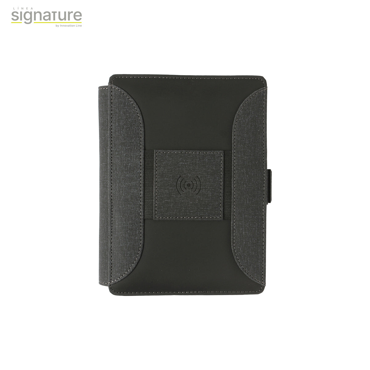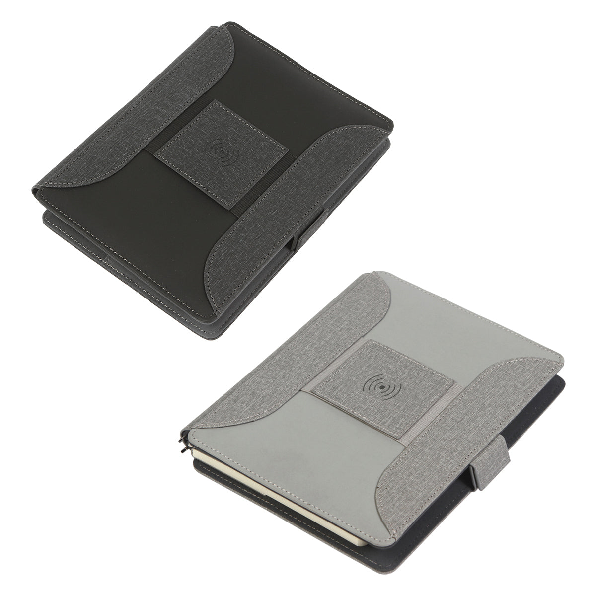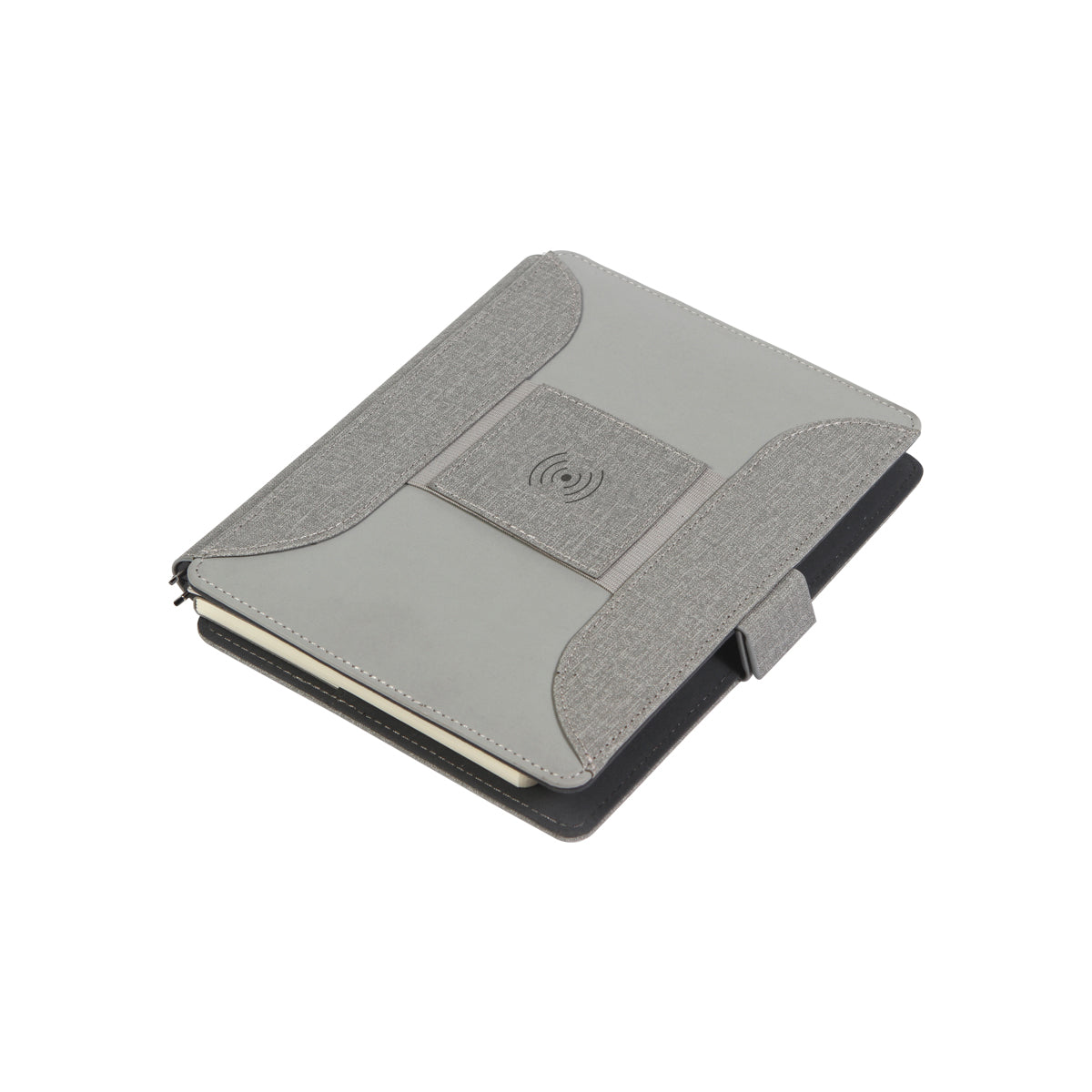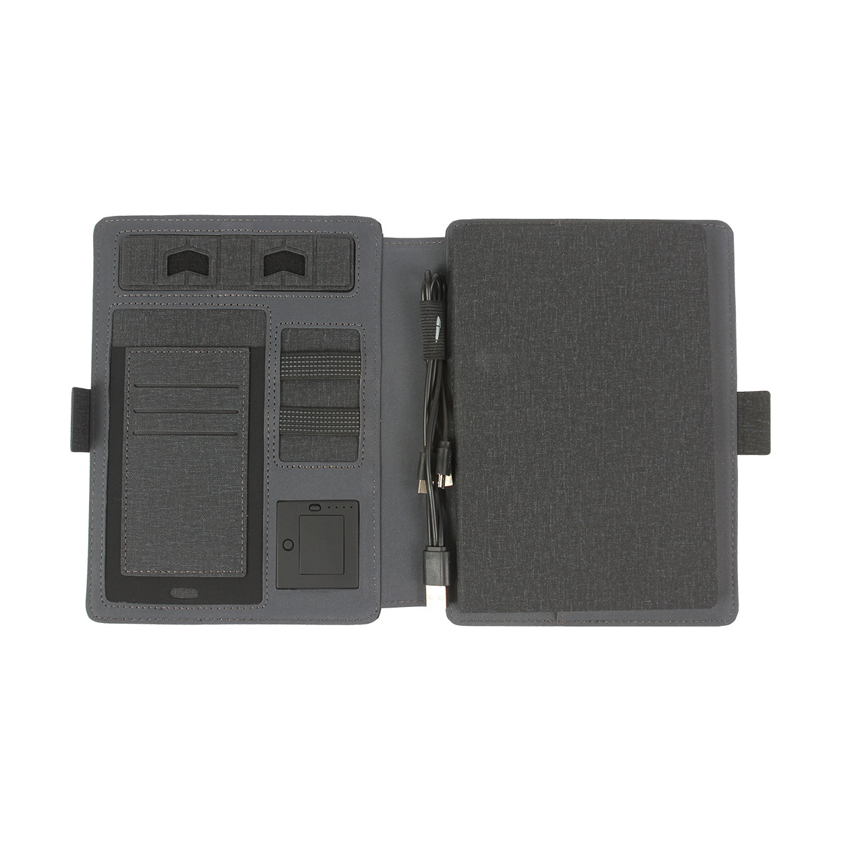carpeta con cargador inalámbrico y power bank de 6,000 mah, con compartimentos para almacenaje, porta plumas y tarjetero, sujetadores de cables y base para teléfono móvil. libreta con hojas rayadas y broches de seguridad.