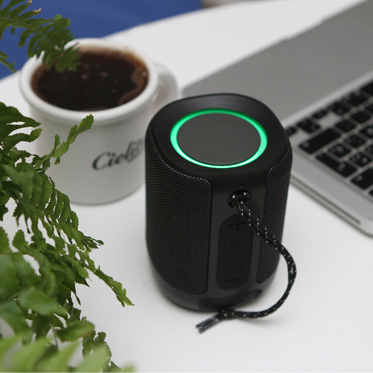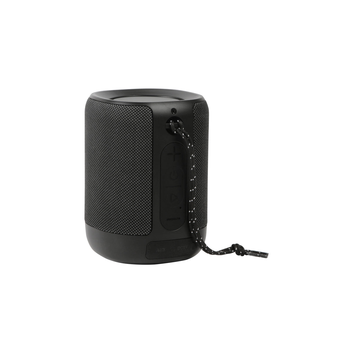 bocina con conexión de sonido sin cables, radio fm, calidad de sonido premium, fabricada en plástico abs+metal, con cubierta de tela e iluminación led en la parte superior. incluye cordón para fácil transportación y cable para carga vía usb y entrada para tarjeta tf. incluye caja de cartón individual.