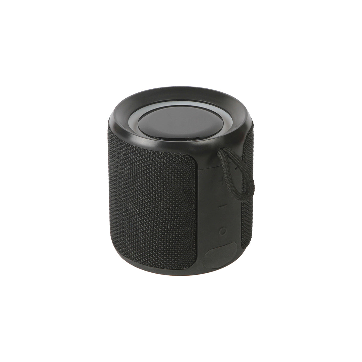 bocina con conexión de sonido sin cables a prueba de agua fabricada en plástico abs y metal, con cubierta de tela, acabado mate, cordón e iluminación led en la parte superior, a un costado tiene 3 botones para controlar el volumen, con una entrada protegida para recargar la pila. incluye cable de carga usb y caja de cartón individual.