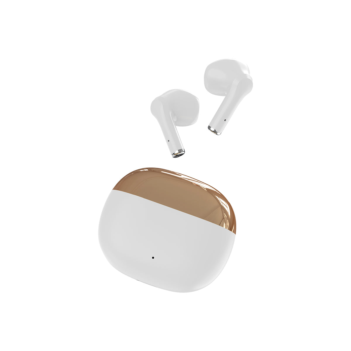 audífonos con conexión de sonido sin cables bi-tono, en la parte superior con acabado brilloso, y parte inferior con acabado mate, con estuche de carga ovalado, los audífonos tienen un ligero detalle en color plateado en la parte inferior. incluye cable de carga usb y caja de cartón individual.