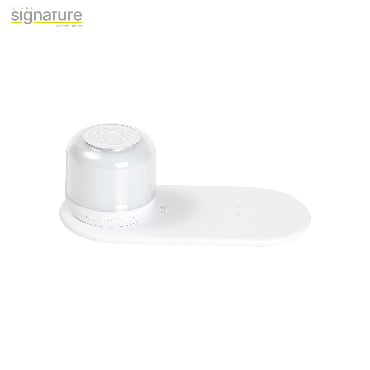 juego de cargador inalámbrico con tecnología qi y bocina con conexión de sonido sin cables, con lampara fabricados en plástico abs, con superficie antiderrapante en la base del cargador. carga a través de cable usb (incluido).