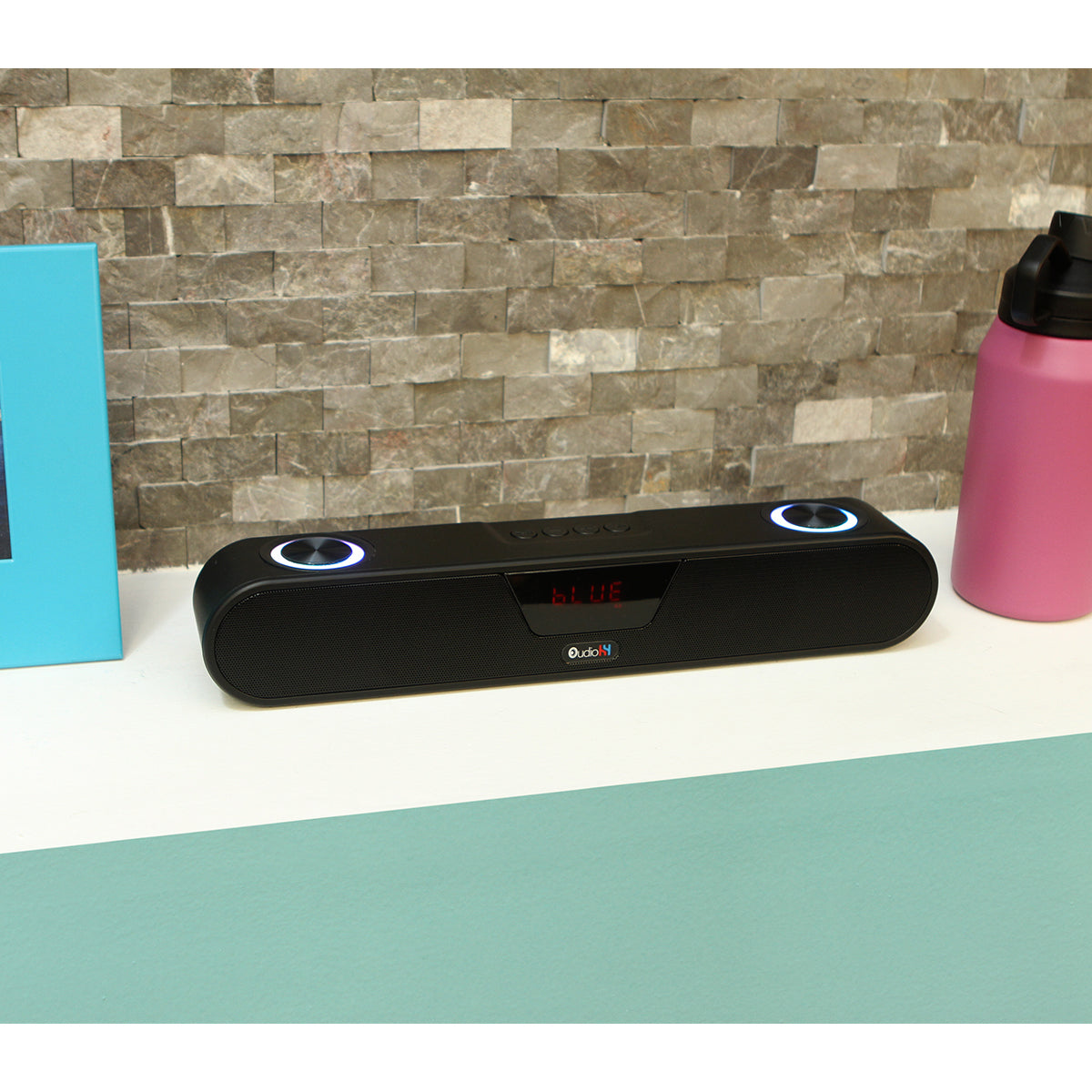 bocina con conexión de sonido sin cables, radio fm, entrada para tarjeta tf, usb y auxiliar. incluye cable de carga tipo-c. en la parte superior cuenta con 4 botones para funciones y 2 luces led. en la parte frontal tiene una pequeña pantalla. incluye caja de cartón individual.