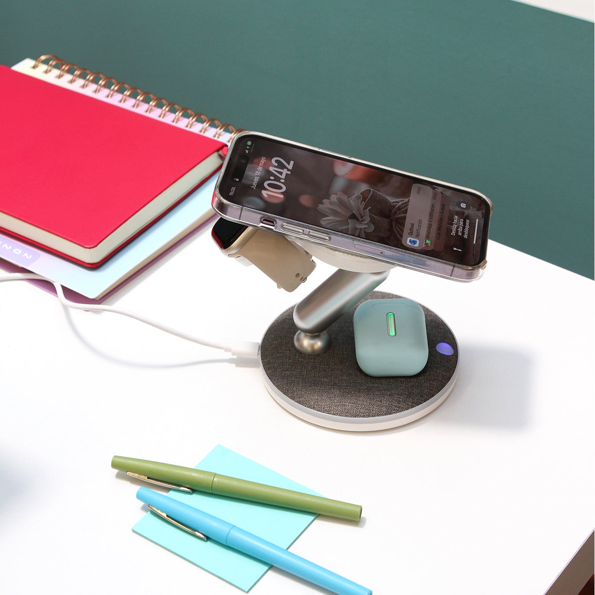 cargador inalámbrico 3 en 1, esta estación de carga rápida permite cargar tu teléfono, reloj y audífonos al mismo tiempo, funciona con dispositivos con tecnología qi. se puede plegar para ahorrar espacio siendo ideal para viajes, hogar u oficina. incluye cable y caja de cartón individual.