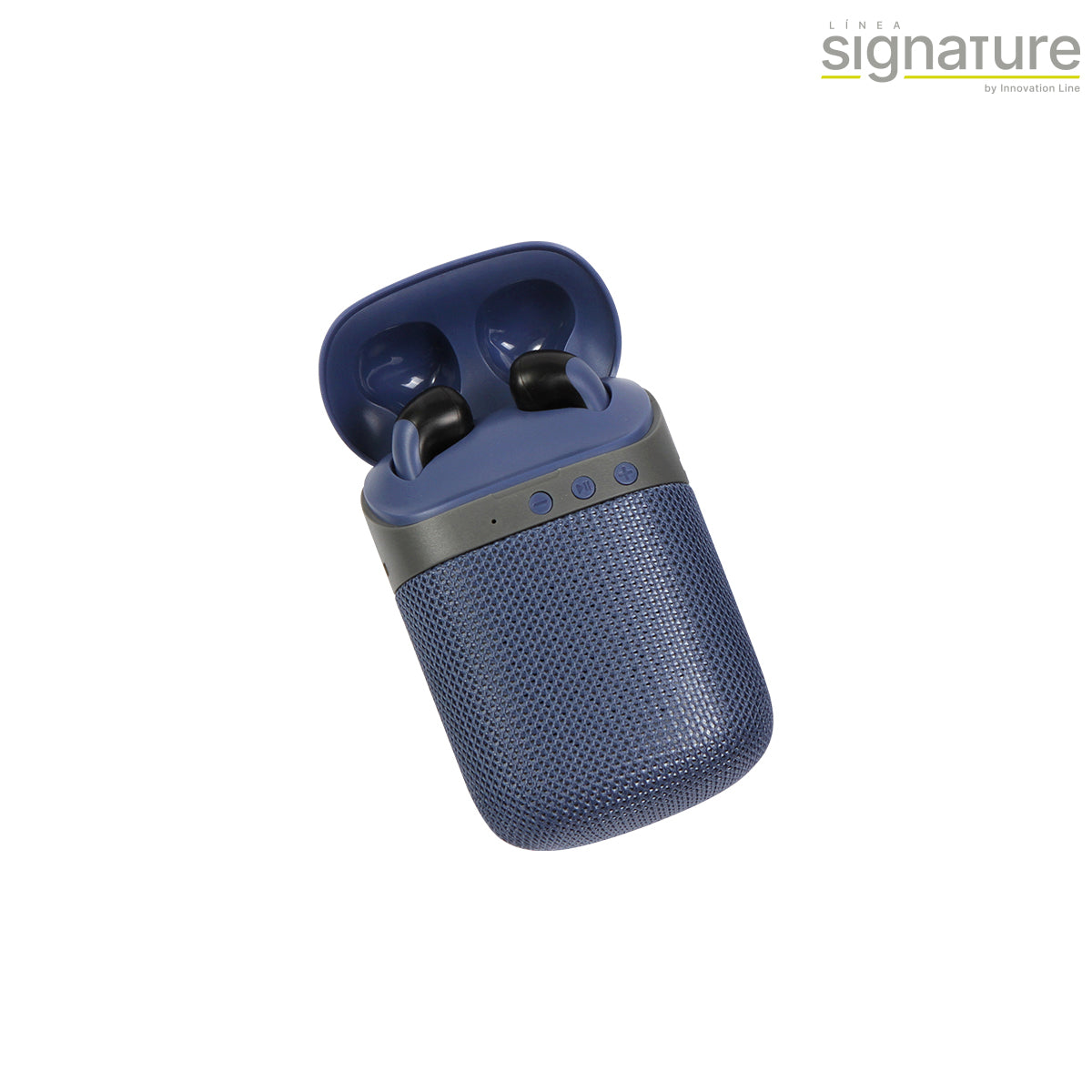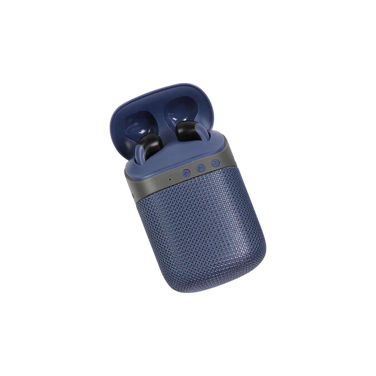 bocina con conexión de sonido sin cables, portátil 2 en 1, incluye audífonos con conexión de sonido sin cables, funcionando como estuche de carga. su tamaño compacto es ideal para llevarla a todos lados. tiene una muy buena calidad de sonido y un diseño ergonómico y novedoso. incluye caja de cartón individual y cable de carga usb.
