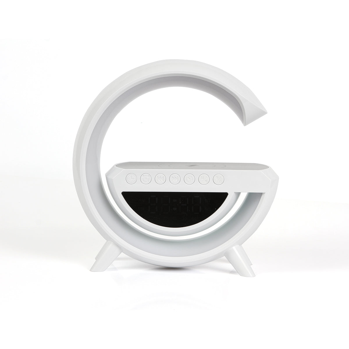 bocina con conexión de sonido sin cables, diseño "g" es un dispositivo multifuncional que combina estilo y utilidad en un solo producto. su diseño elegante y moderno, no solo ofrece un aspecto atractivo, sino que también integra diversas funciones para mejorar tu experiencia diaria. incluye una lámpara incorporada que agrega un toque de iluminación ambiental a su espacio, reloj integrado en la bocina que te permite tener siempre a la vista la hora actual, brindándote una herramienta práctica y funcional para tu día a día y base de carga inalámbrica qi. incluye caja de cartón individual y cable usb.