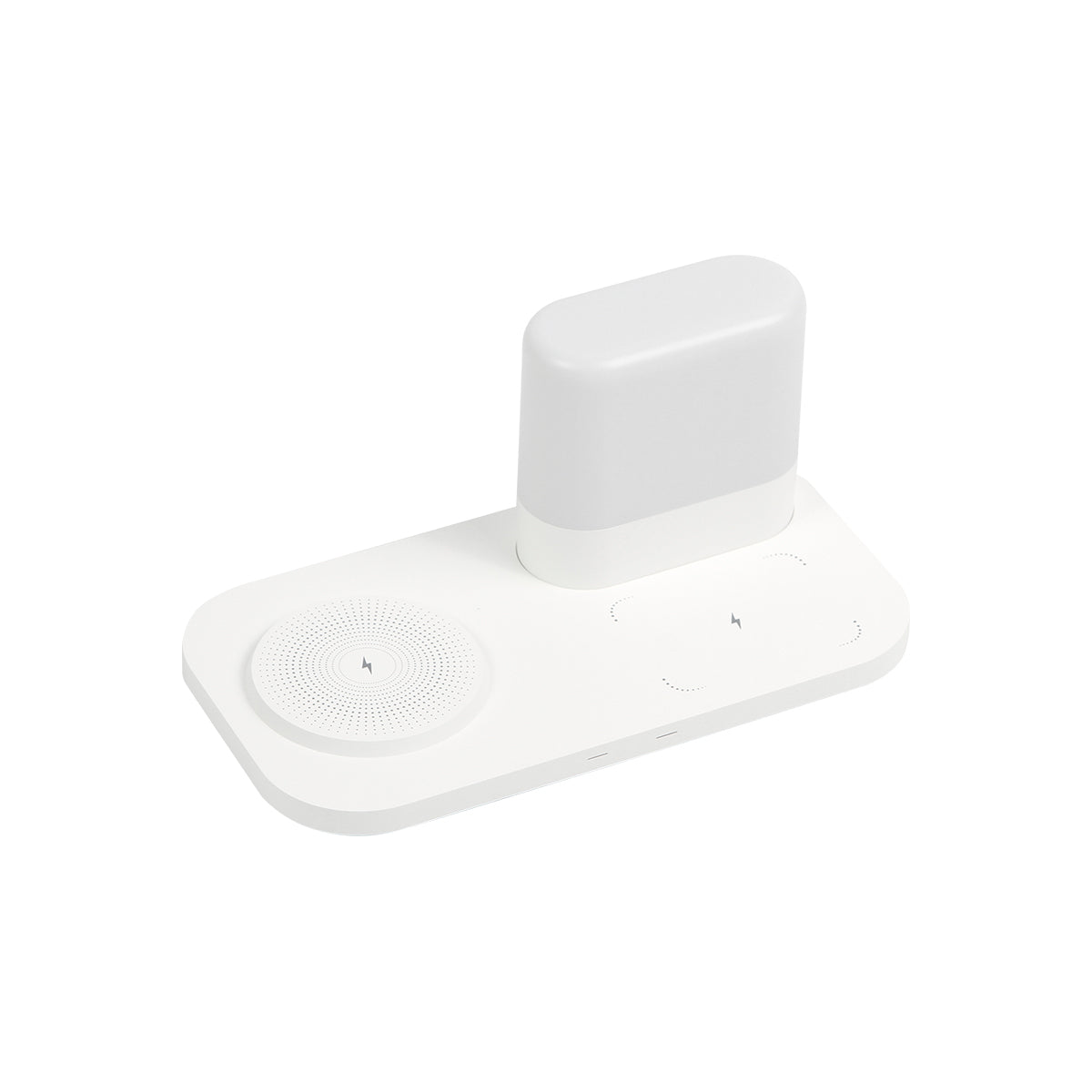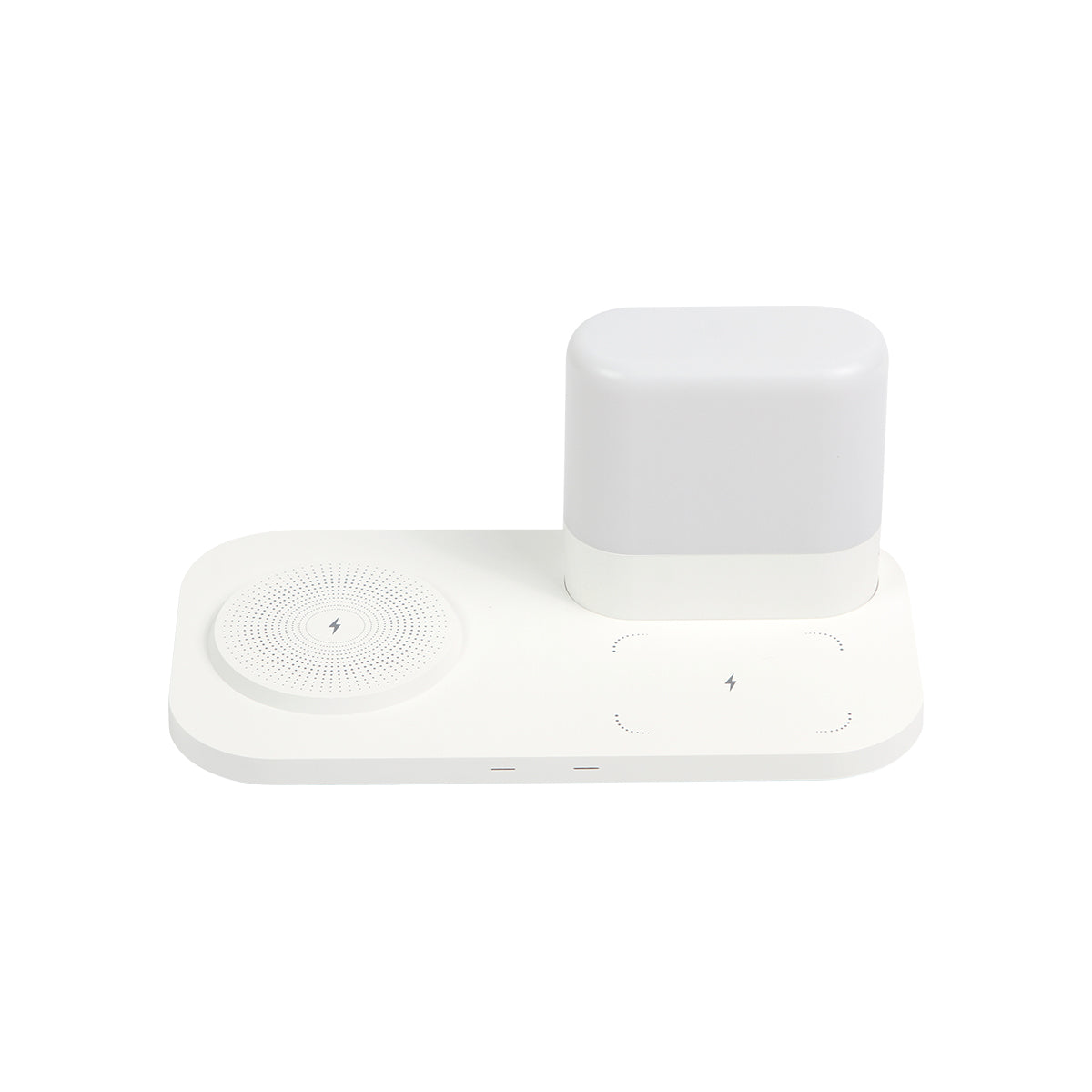 cargador inalámbrico fabricado en plástico 4 en 1 (celular, lámpara, audífonos y reloj inteligente) de 15 w con lámpara led táctil e interfaz de carga adicional para smart watch.