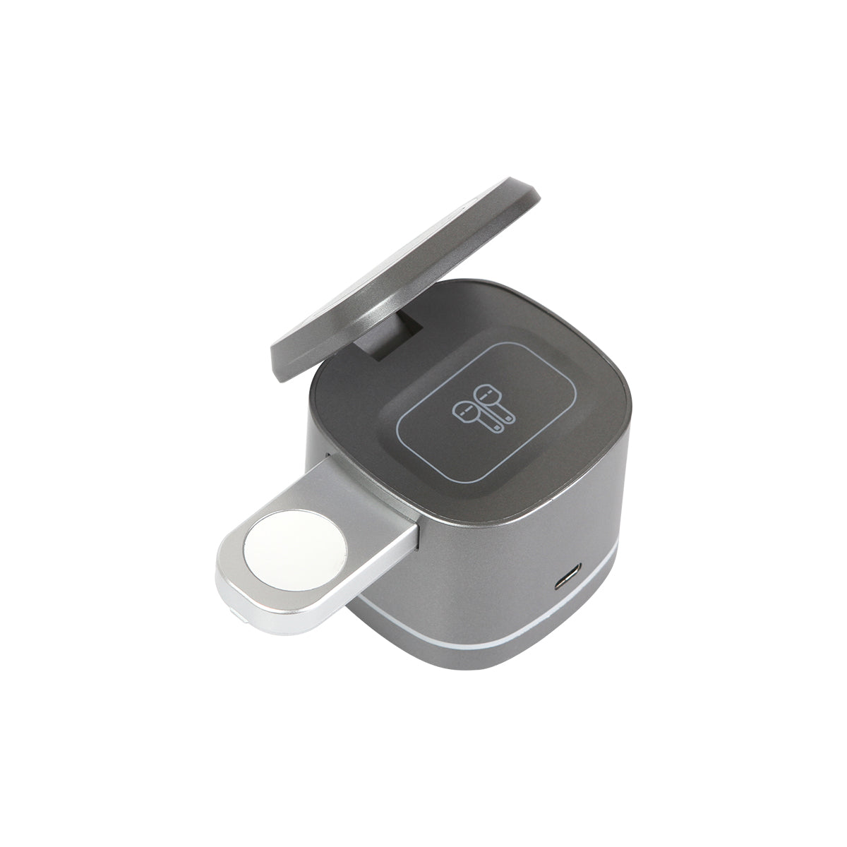 cargador inalámbrico fabricado en abs y plástico de policarbonato (pc), compatible con celular, reloj, y audífonos. potencia de carga de 5w/7,5w/10w/15w para celular, 2,5w para reloj inteligente y 3w para audífonos inalámbricos.