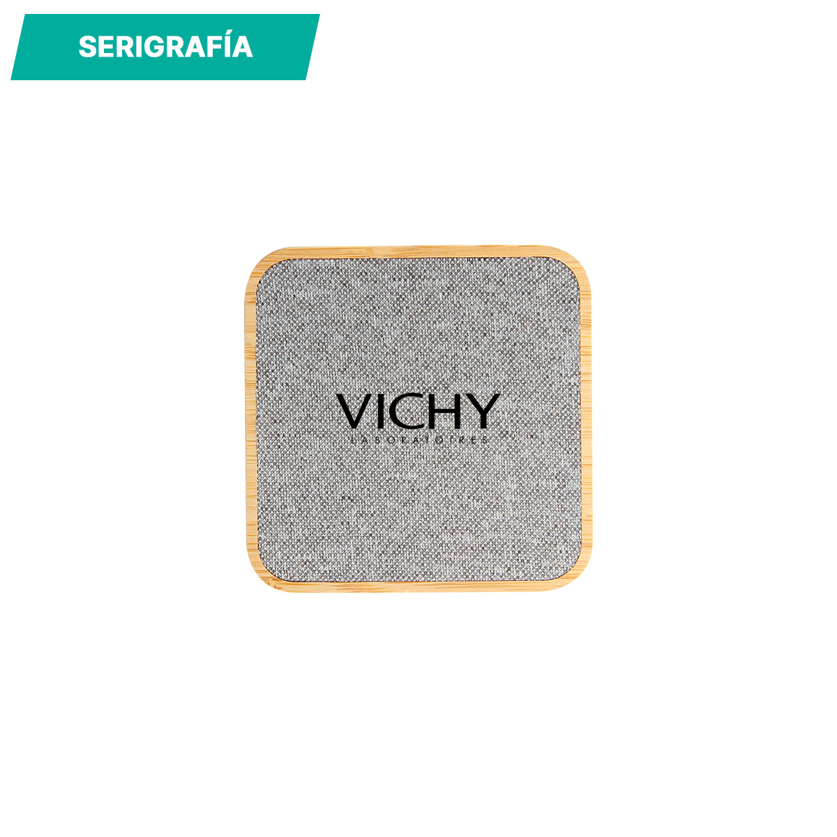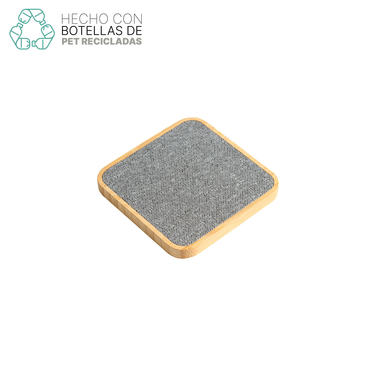 cargador inalámbrico fabricado en madera de bambú con forro de rpet. potencia de carga de 10 w. compatible con dispositivos con tecnología qi.