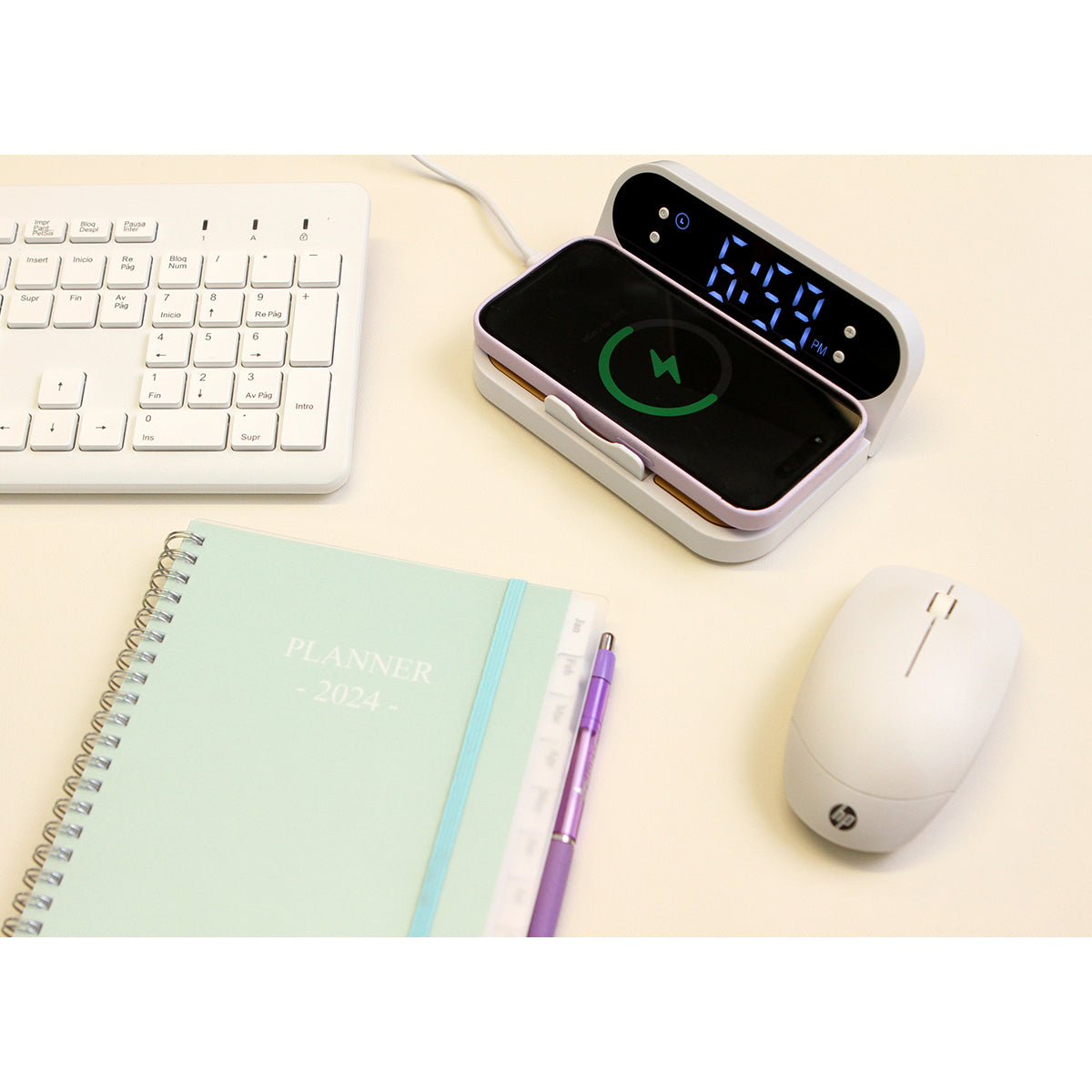 cargador inalámbrico con panel fabricado en bambú. cuenta con reloj y alarma de pantalla ajustable. incluye soporte para celular y salidas usb-a y usb-c para cargar más dispositivos.