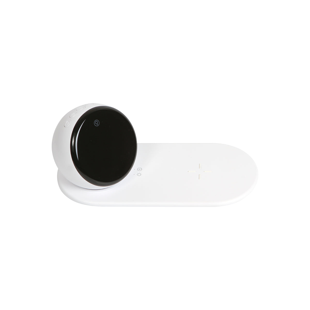 reloj con cargador inalámbrico. cuenta con funciones de bocina con conexión de sonido sin cables, luz nocturna, potencia de carga de hasta 15w. diseño ergonómico. compatible con dispositivos con tecnología qi. indicador de carga. también puede usarse como alarma. incluye reproductor de ruido blanco para propiciar un mejor descanso.