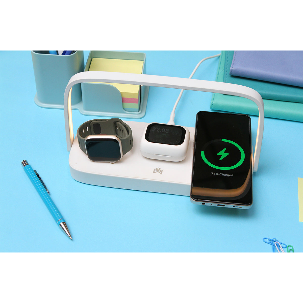 cargador inalámbrico fabricado en abs y plástico de policarbonato (pc), compatible con celular, reloj, y audífonos. potencia de carga de 5w/7,5w/10w/15w para celular, 2,5w para reloj inteligente y 3w para audífonos inalámbricos. incluye manija y función de luz nocturna.