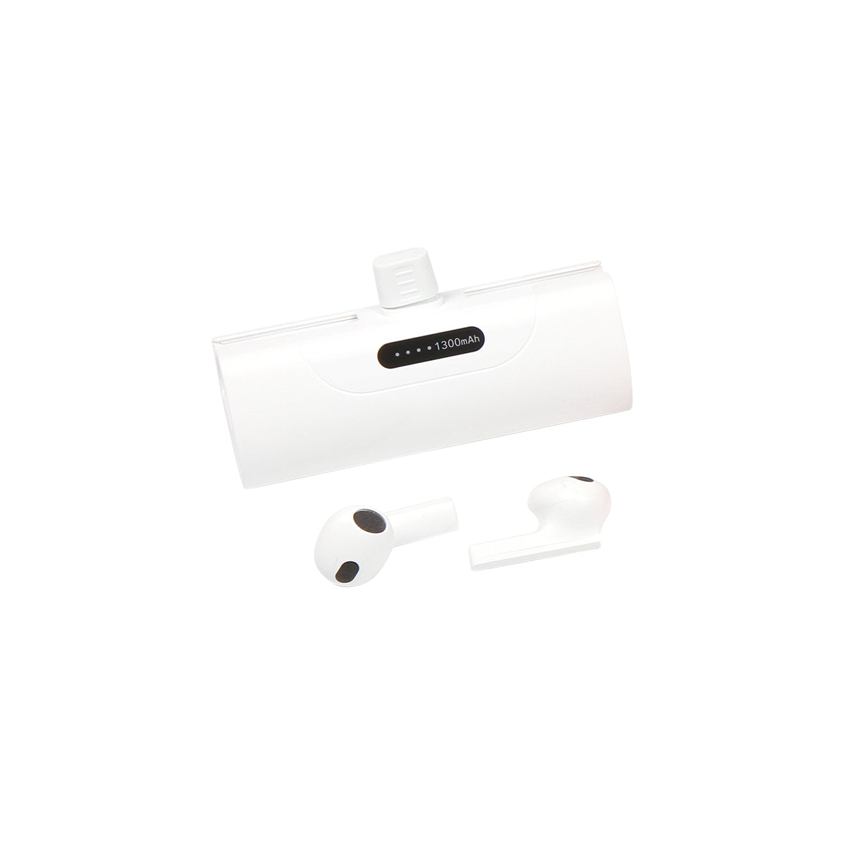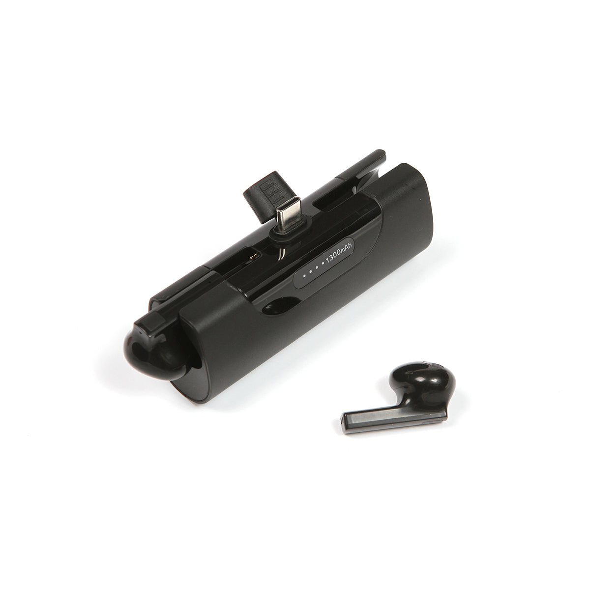 audífonos inalámbricos con power bank fabricados en plástico abs batería principal 1,300 mah y batería de los audífonos 25 mah. tiempo de carga de los audífonos 1 hora, tiempo de reproducción a volumen medio de 3 a 4 horas. distancia de transmisión libre de obstáculos 10 metros aproximadamente. puerto de carga tipo c.