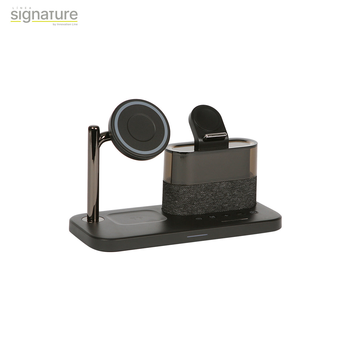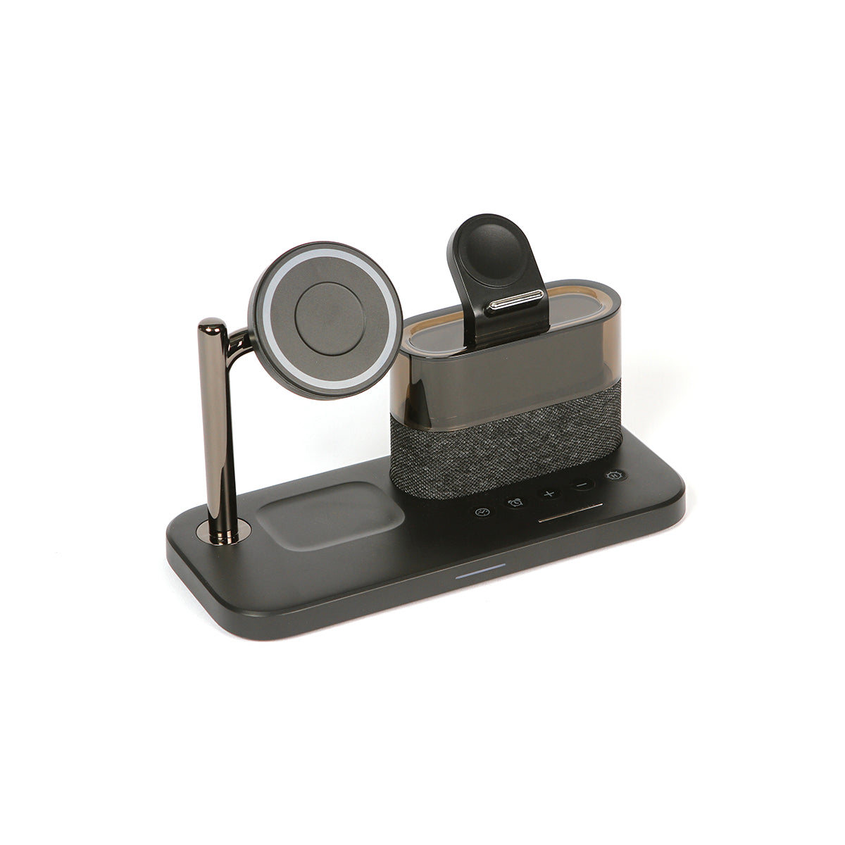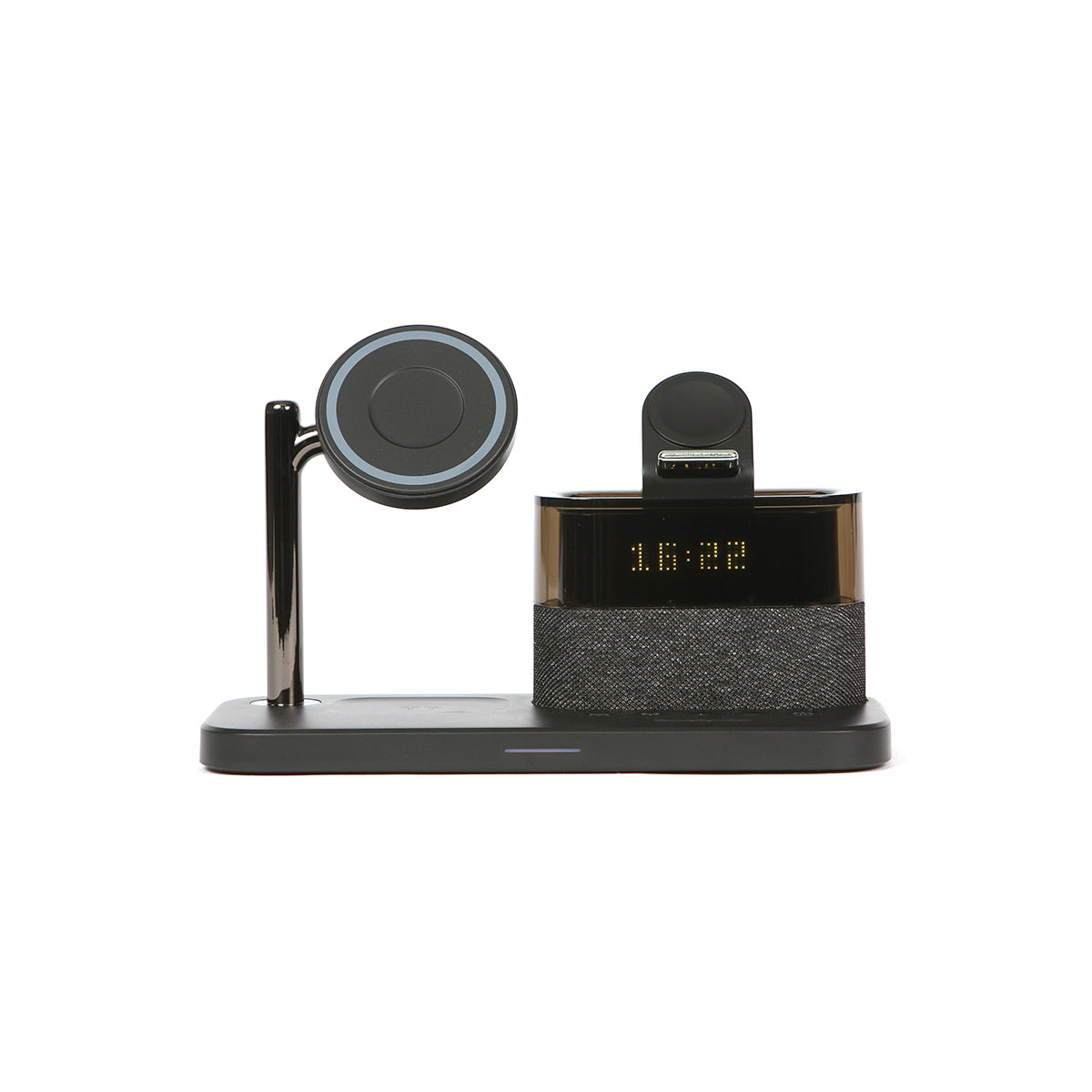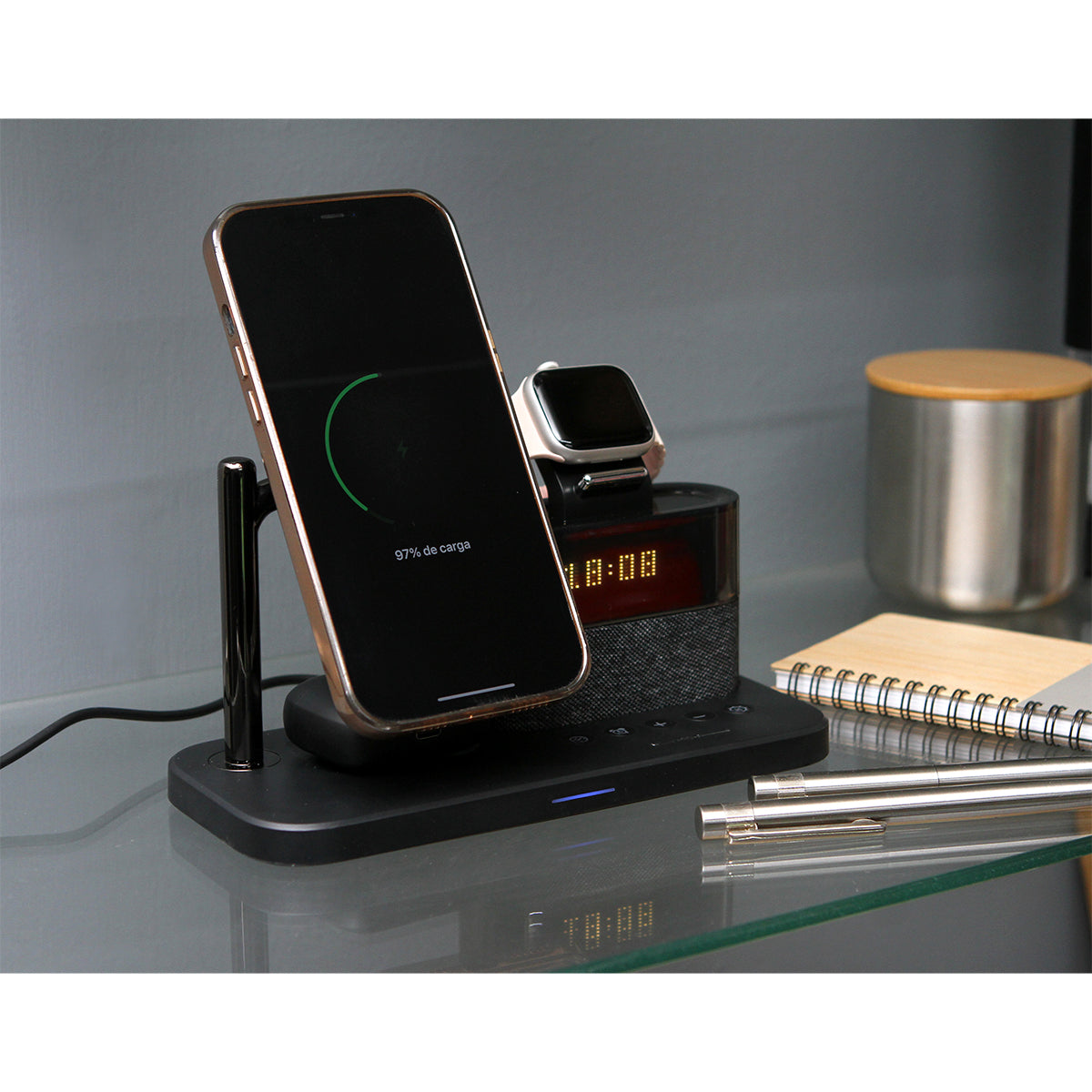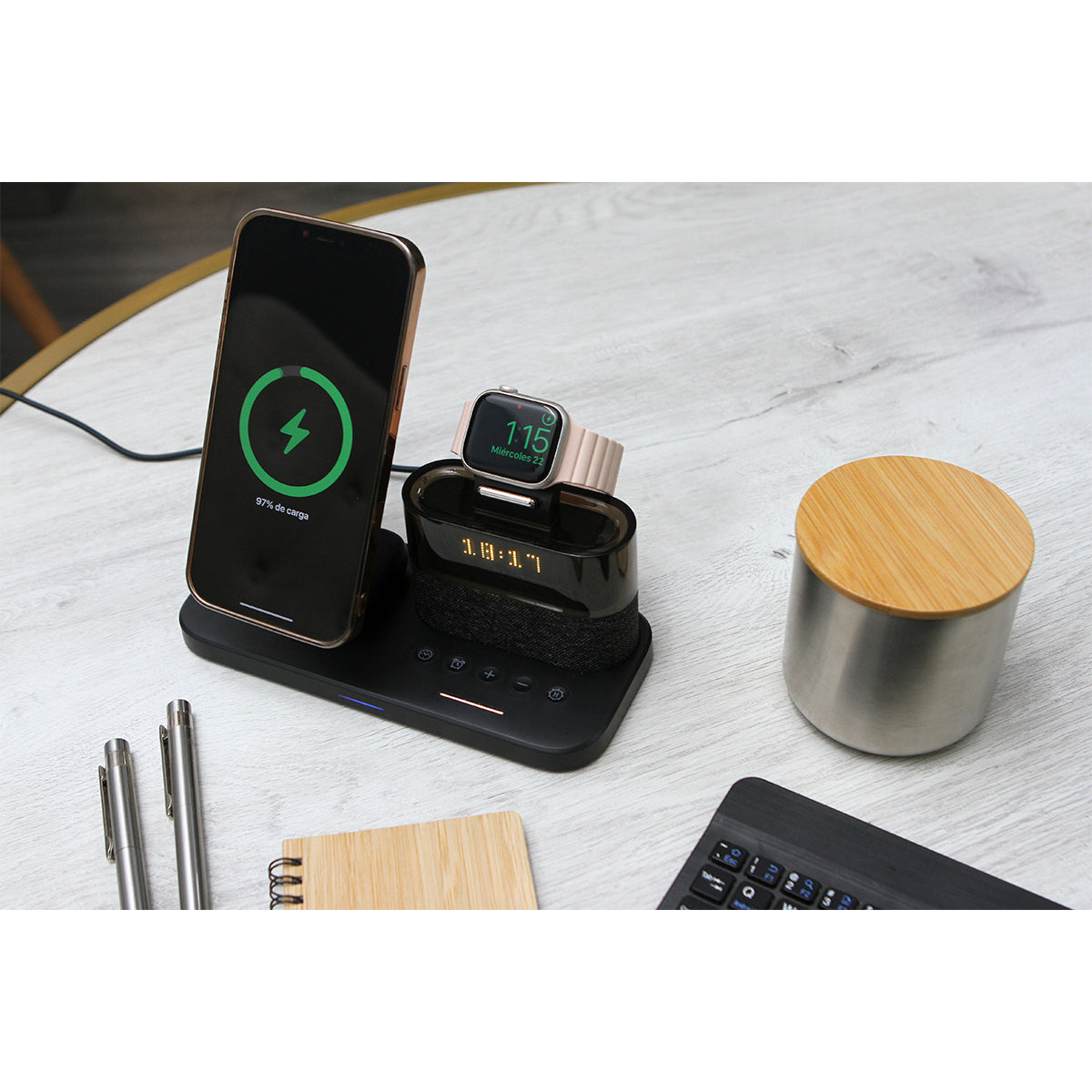 cargador con imán multifuncional para teléfono celular y audífonos inalámbricos. con reloj y función de alarmas, incluye una lámpara de lectura. diseño ergonómico especializado para escritorio y/o buró.