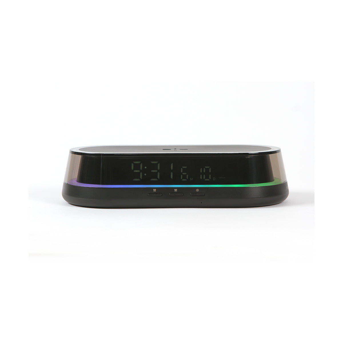 cargador inalámbrico multifuncional para teléfono celular 15w. con reloj y función de alarmas, incluye una lámpara de luz blanca en tres niveles y luz tipo rgb (colores). diseño ergonómico especializado para escritorio y/o buró.