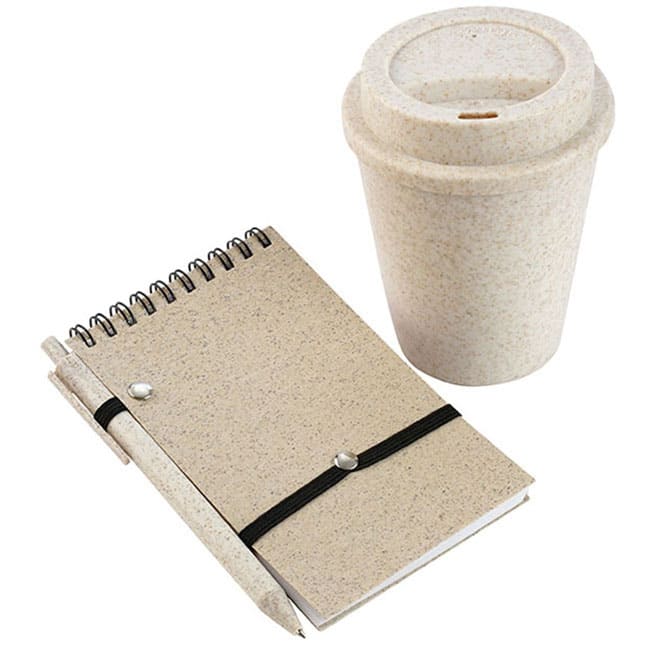 descripción del producto Set Trigal Funciones: Incluye Vaso con tapa para café , Block de notas con argollas y Bolígrafo Capacidad vaso: 350 ml Block: 60 hojas rayadas y cierre en elástico