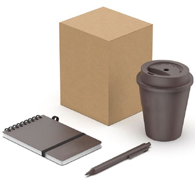 incluye vaso con tapa para café , block de notas con argollas y bolígrafo.capacidad vaso : 350 ml.fabricado con grado alimenticio y libre de bpa.block : 60 hojas rayadas y cierre en elástico.