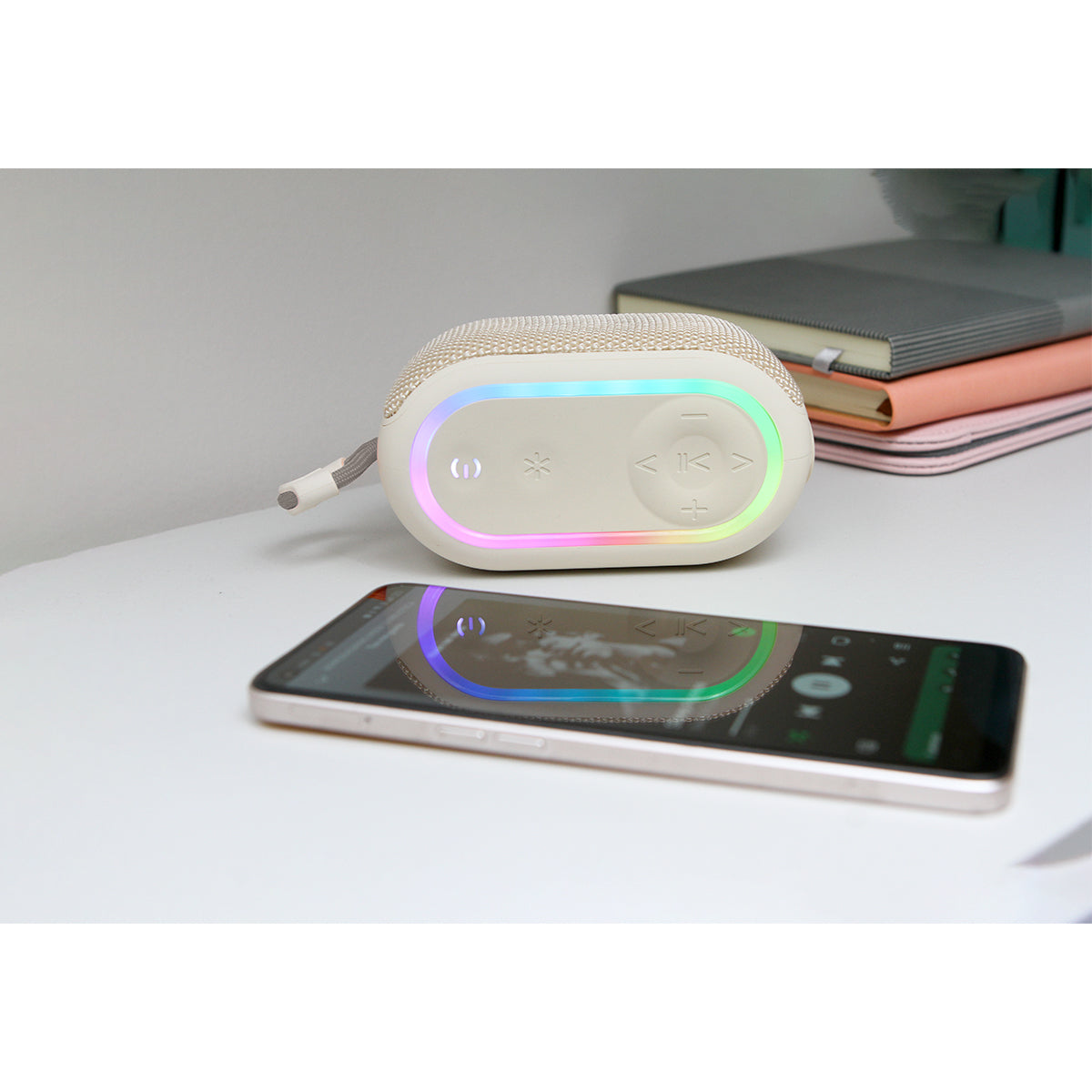 bocina con conexión inalámbrica con radio fm. cuenta con efectos de luces de colores, tiempo de reproducción de hasta 6 horas continuas a volumen medio, con un tiempo de carga de 2 horas con entrada tipo c, diseño adecuado para un modelo portátil. cuenta con una entrada auxiliar, usb, tws, tarjeta micro sd, fm, recepción de llamadas y asistente de voz. su alcance de funcionamiento inalámbrico es de hasta 10 metros sin obstáculos. cuenta con tecnología tws, la cual permite emparejar dos dispositivos del mismo modelo, lo que significa que puede transmitir el canal izquierdo y el canal derecho por separado en cada dispositivo.