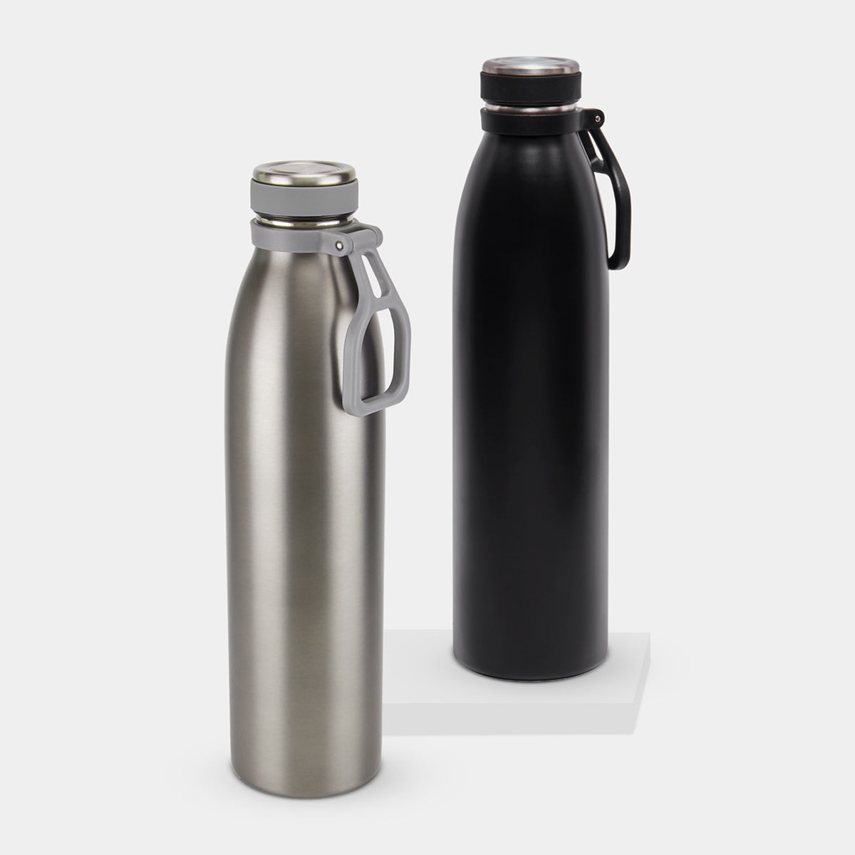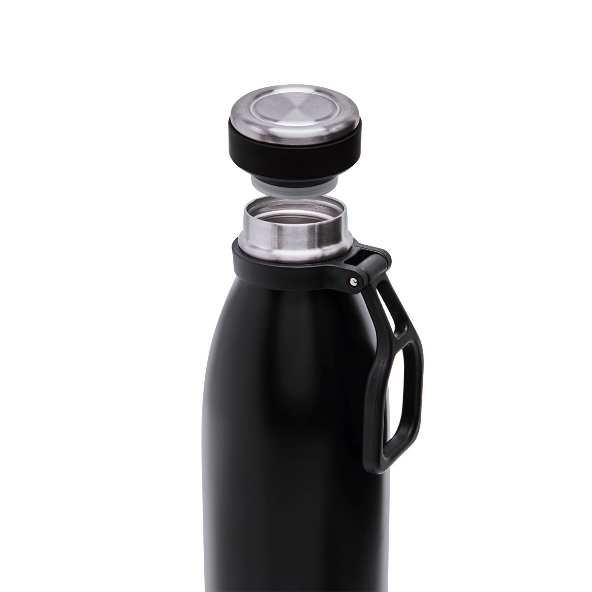 doble pared. cerrado al vacío. pared interna y externa acero inoxidable. tapa de rosca con banda de silicón. cuenta con asa de plástico plegable. mantiene temperatura caliente 8 hrs y temperatura fría 12 hrs aproximadamente. incluye caja individual.