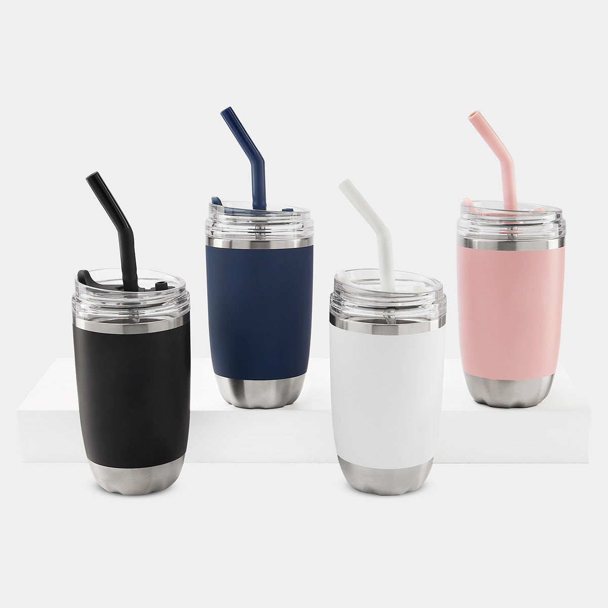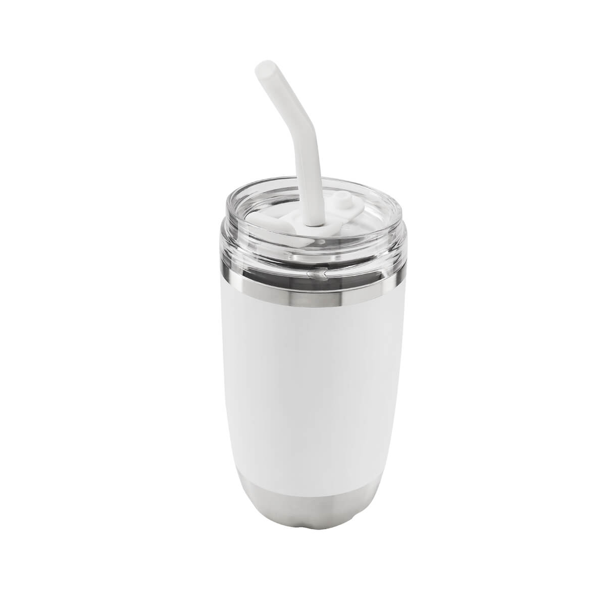 doble pared. cerrado al vacío. pared interna y externa de acero inoxidable. tapa push de plástico con sobretapa de silicón removible y ranura especial con tapón para popote. incluye popote metálico con boquilla de silicón. mantiene temperatura caliente 2 hrs y temperatura fría 8 hrs. caja individual incluida.