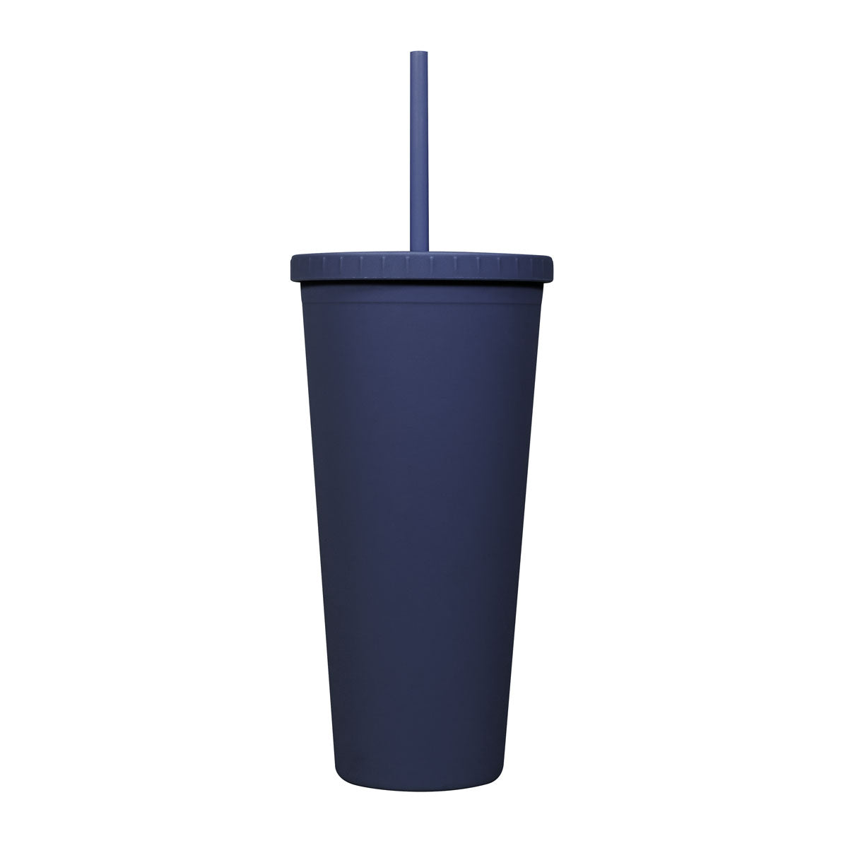 doble pared. pared interna y externa de plástico. tapa de plástico con sistema de rosca. incluye popote. cuerpo y tapa con terminado tipo rubber. capacidad 22 oz. base de 6.6 cm de diámetro. caja individual incluida.