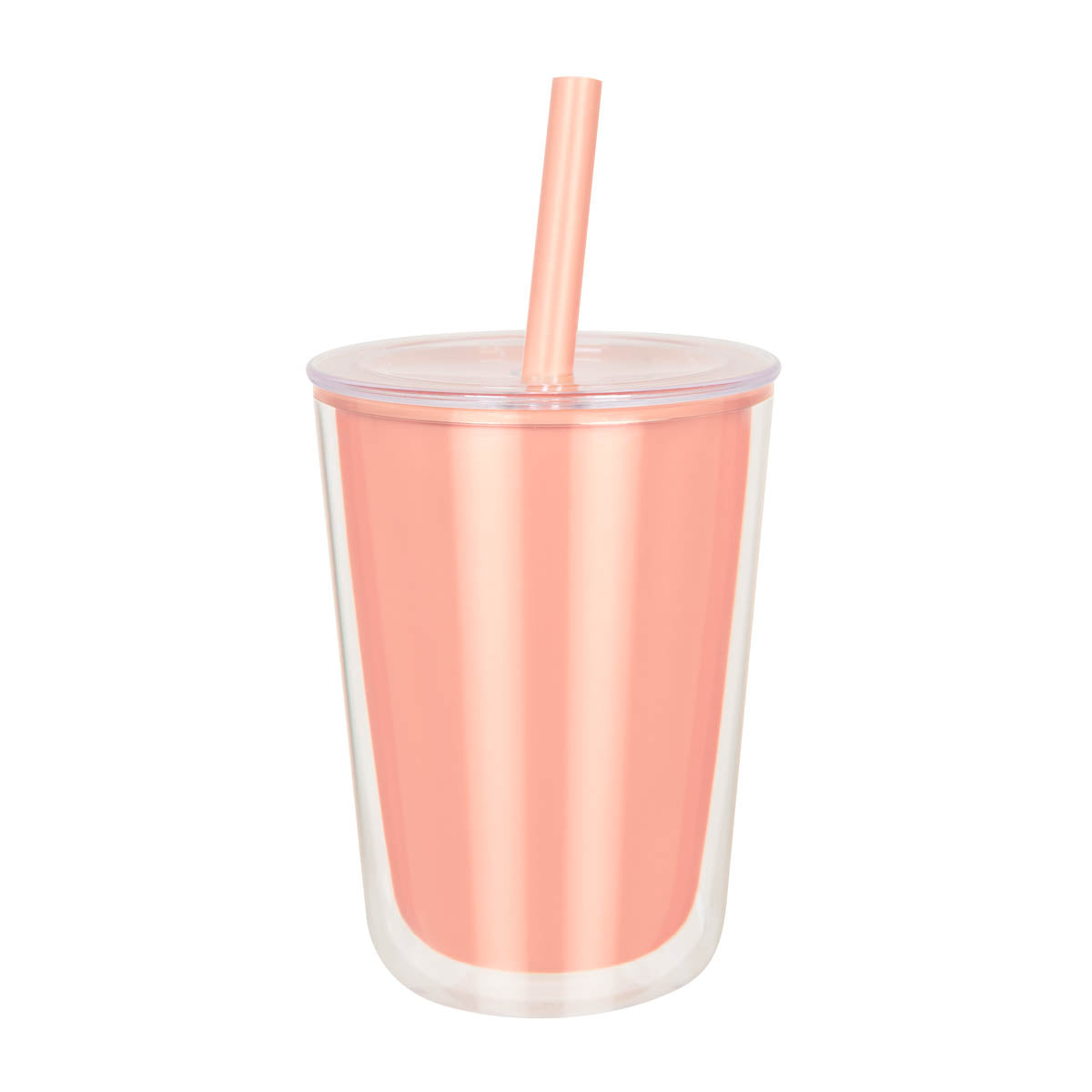 vaso de plástico doble pared. su peculiar diseño, cuenta con una pared interna de color y una pared externa transparente, que le da un aspecto moderno y vibrante. la tapa con cierre push y el popote a juego, añaden originalidad a este vaso. ideal para llevar tus bebidas favoritas a donde vayas. capacidad de 23 oz. base de 9 cm de diámetro. incluye caja individual.