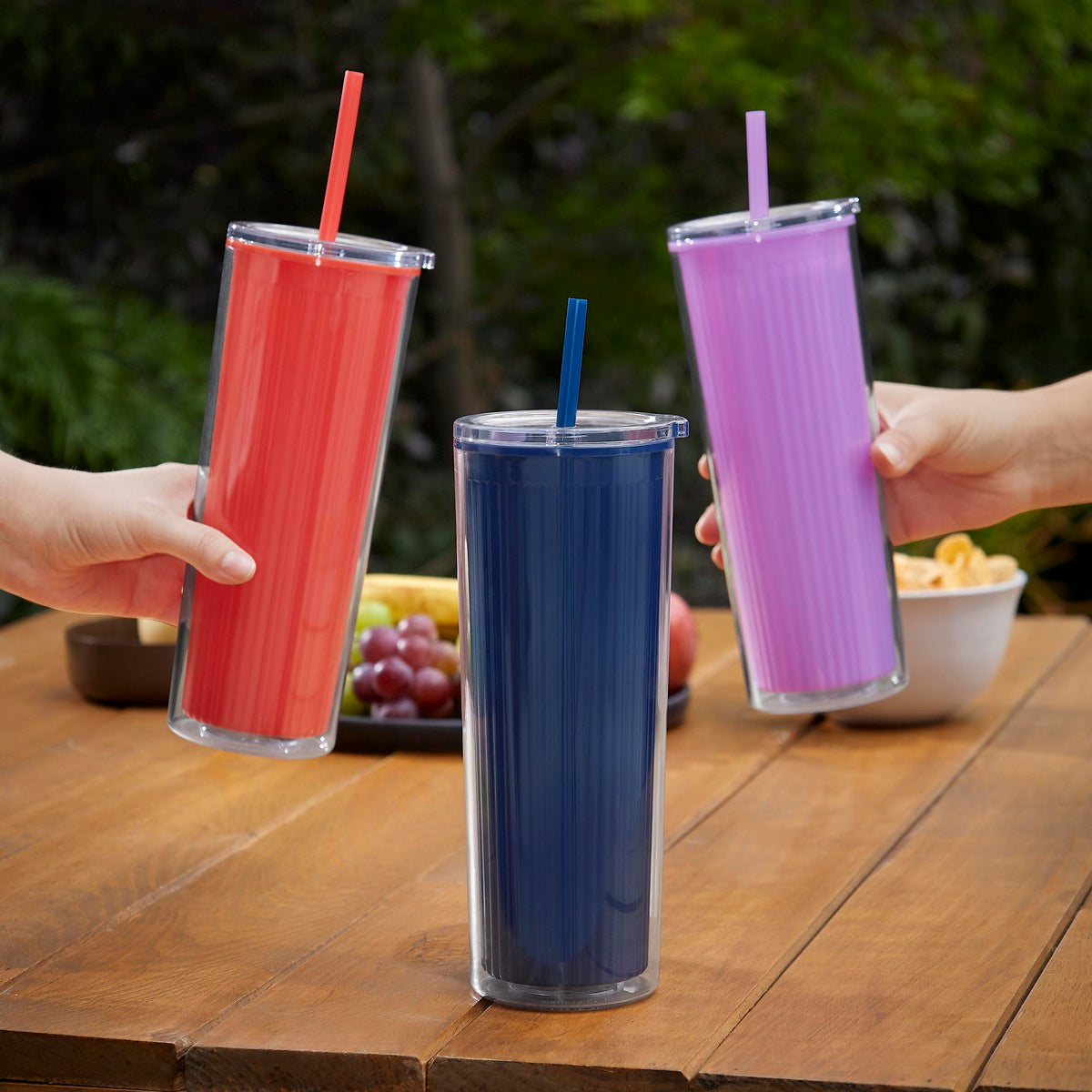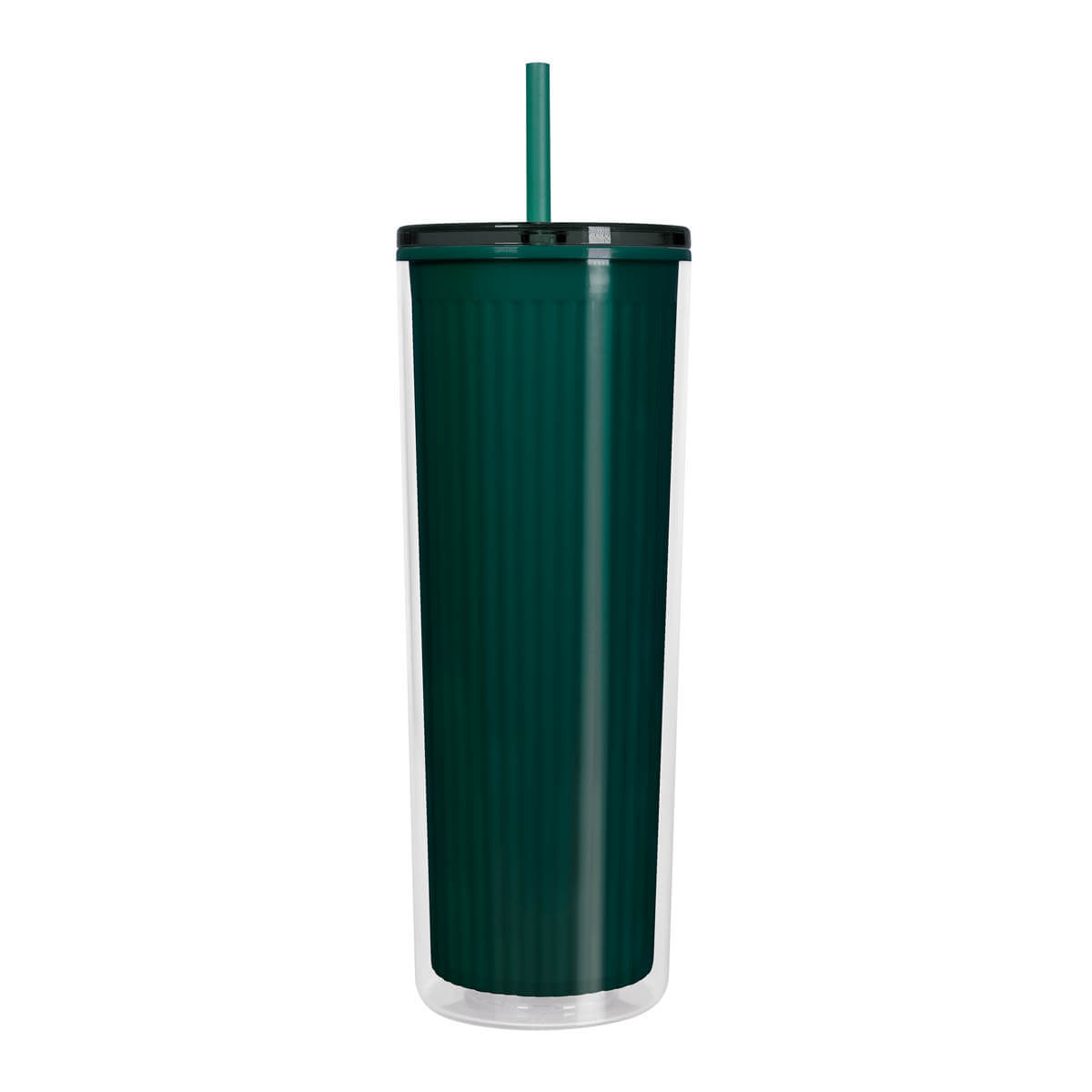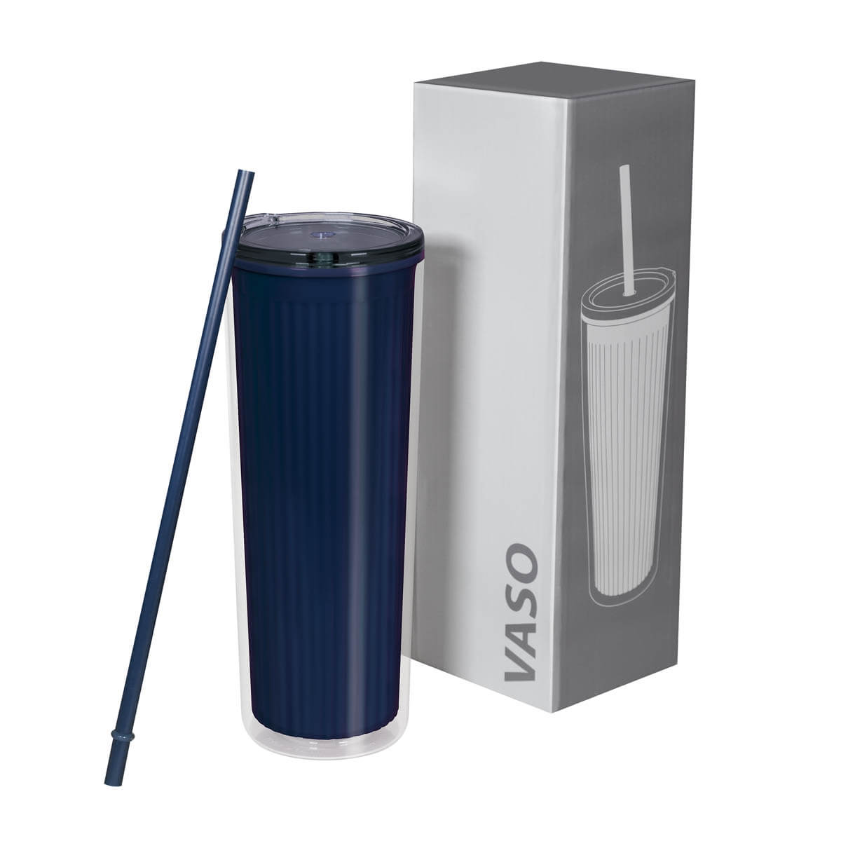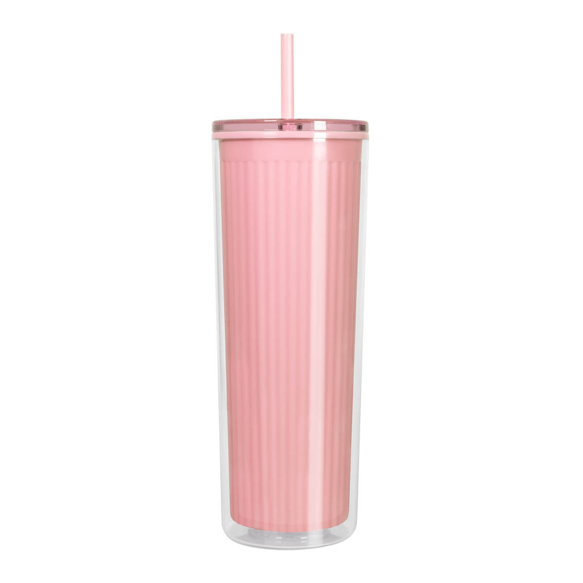 termo de plástico doble pared. pared interna de color, texturizada a rayas, y pared externa lisa y transparente que, en conjunto, ofrecen un diseño moderno y vibrante. incluye tapa de plástico con sistema push y popote a juego. capacidad de 22 oz. base de 7.5 cm de diámetro. incluye caja individual.